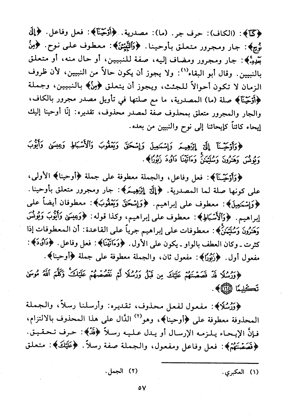 {كَمَا}: (الكاف): حرف جر. (ما): مصدرية. {أَوْحَيْنَا}: فعل وفاعل. {إِلَى نُوحٍ}: جار ومجرور متعلق بأوحينا. {وَالنَّبِيِّينَ}: معطوف على نوح. {مِنْ بَعْدِهِ}: جار ومجرور ومضاف إليه، صفة للنبيين، أو حال منه، أو متعلق بالنبيين. وقال أبو البقاء (¬1): ولا يجوز أن يكون حالًا من النبيين؛ لأن ظروف الزمان لا تكون أحوالًا للجثث، ويجوز أن يتعلق {مِنْ} بالنبيين، وجملة {أَوْحَيْنَا} صلة (ما) المصدرية، ما مع صلتها في تأويل مصدر مجرور بالكاف، والجار والمجرور متعلق بمحذوف صفة لمصدر محذوف، تقديره: إنّا أوحينا إليك إيحاء كائنًا كإيحائنا إلى نوح والنبيين من بعده.