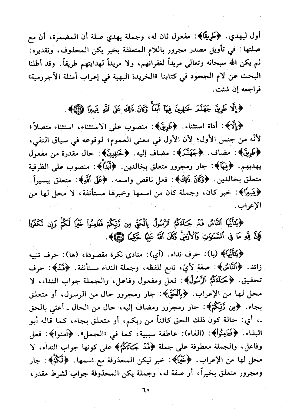 {إِلَّا}: أداة استثناء. {طَرِيقَ}: منصوب على الاستثناء، استثناء متصلًّا؛ لأنه من جنس الأول؛ لأن الأول في معنى العموم؛ لوقوعه في سياق النفي، {طَرِيقَ}: مضاف. {جَهَنَّمَ} مضاف إليه. {خَالِدِينَ}: حال مقدرة من مفعول يهديهم. {فِيهَا}: جار ومجرور متعلق بخالدين {أَبَدًا}: منصوب على الظرفية متعلق بخالدين. {وَكَانَ ذَلِكَ}: فعل ناقص واسمه. {عَلَى اللَّهِ}: متعلق بيسيرًا. {يَسِيرًا}: خبر كان، وجملة كان من أسمها وخبرها مستأنفة، لا محل لها من الإعراب.