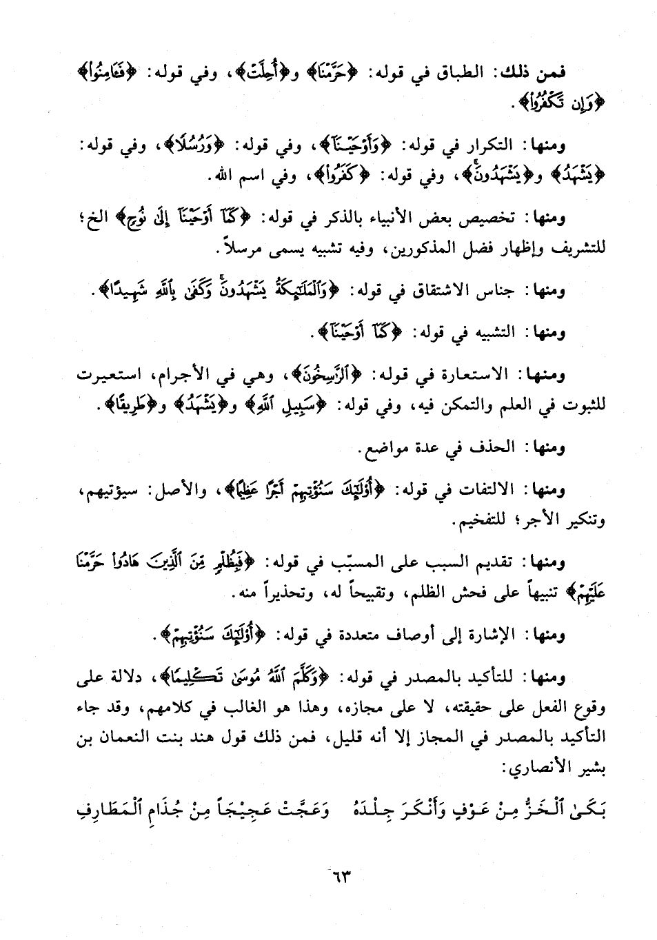 ومنها: للتأكيد بالمصدر في قوله: {وَكَلَّمَ اللَّهُ مُوسَى تَكْلِيمًا}، دلالة على وقوع الفعل على حقيقته، لا على مجازه، وهذا هو الغالب في كلامهم، وقد جاء التأكيد بالمصدر في المجاز إلا أنه قليل، فمن ذلك قول هند بنت النعمان بن بشير الأنصاري:
