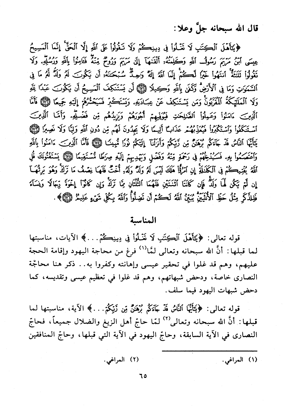 قوله تعالى: {يَا أَهْلَ الْكِتَابِ لَا تَغْلُوا فِي دِينِكُمْ ...} الآيات، مناسبتها لما قبلها: أنَّ الله سبحانه وتعالى لمَّا (¬1) فرغ من محاجة اليهود وإقامة الحجة عليهم، وهم قد غلوا في تحقير عيسى وإهانته وكفروا به .. ذكر هنا محاجة النصارى خاصة، ودحض شبهاتهم، وهم قد غلوا في تعظيم عيسى وتقديسه، كما دحض شبهات اليهود فيما سلف.