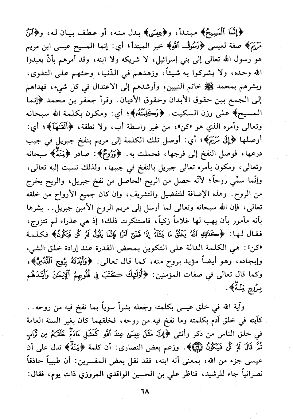 وآية الله في خلق عيسى بكلمته وجعله بشرًا سويًّا بما نفخ فيه من روحه .. كآيته في خلق آدم بكلمته وما نفخ فيه من روحه، فخلقهما كان بغير السنة العامة في خلق الناس من ذكر وأنثى {إِنَّ مَثَلَ عِيسَى عِنْدَ اللَّهِ كَمَثَلِ آدَمَ خَلَقَهُ مِنْ تُرَابٍ ثُمَّ قَالَ لَهُ كُنْ فَيَكُونُ (59)}. وزعم بعض النصارى: أن كلمة {مِنْهُ} تدل على أن عيسى جزء من الله، بمعنى أنه ابنه، فقد نقل بعض المفسرين: أن طبيبًا حاذقًا نصرانيًّا جاء للرشيد، فناظر علي بن الحسين الواقدي المروزي ذات يوم، فقال: