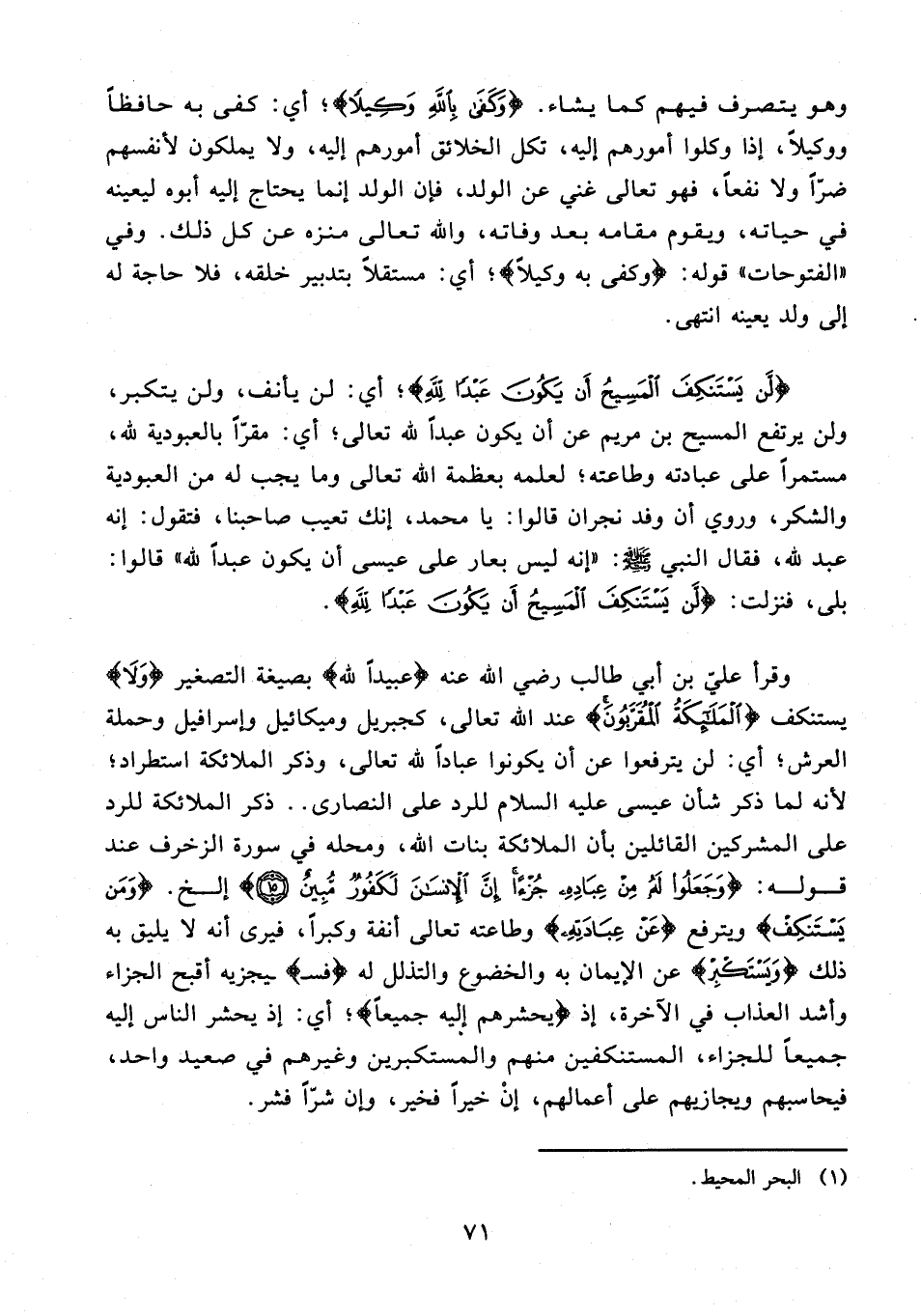 172 - {لَنْ يَسْتَنْكِفَ الْمَسِيحُ أَنْ يَكُونَ عَبْدًا لِلَّهِ}؛ أي: لن يأنف، ولن يتكبر، ولن يرتفع المسيح بن مريم عن أن يكون عبدًا لله تعالى؛ أي: مقرًّا بالعبودية لله، مستمرًا على عبادته وطاعته؛ لعلمه بعظمة الله تعالى وما يجب له من العبودية والشكر، وروي أن وفد نجران قالوا: يا محمَّد، إنك تعيب صاحبنا، فتقول: إنه عبد لله، فقال النبي - صلى الله عليه وسلم -: "إنه ليس بعار على عيسى أن يكون عبدًا لله" قالوا: بلى، فنزلت: {لَنْ يَسْتَنْكِفَ الْمَسِيحُ أَنْ يَكُونَ عَبْدًا لِلَّهِ}.