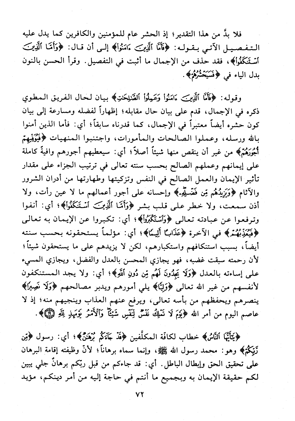 173 - وقوله: {فَأَمَّا الَّذِينَ آمَنُوا وَعَمِلُوا} بيان لحال الفريق المطوي ذكره في الإجمال، قدم على بيان حال مقابله؛ إظهارًا لفضله ومسارعة إلى بيان كون حشره أيضًا معتبرًا في الإجمال، كما قدرناه سابقًا؛ أي: فأما الذين أمنوا باللهِ ورسله، وعملوا الصالحات والمأمورات، واجتنبوا المنهيات {فَيُوَفِّيهِمْ أُجُورَهُمْ} من غير أن ينقص منها شيئًا أصلًا؛ أي: سيعطيهم أجورهم وافيةً كاملة على إيمانهم وعملهم الصالح بحسب سنته تعالى في ترتيب الجزاء على مقدار تأثير الإيمان والعمل الصالح في النفس وتزكيتها وطهارتها من أدران الشرور والآثام {وَيَزِيدُهُمْ مِنْ فَضْلِهِ} وإحسانه على أجور أعمالهم ما لا عين رأت، ولا أذن سمعت، ولا خطر على قلب بشر {وَأَمَّا الَّذِينَ اسْتَنْكَفُوا}؛ أي: أنفوا وترفعوا عن عبادته تعالى {وَاسْتَكْبَرُوا}؛ أي: تكبروا عن الإيمان به تعالى {فَيُعَذِّبُهُمْ} في الآخرة {عَذَابًا أَلِيمًا}؛ "أي: مؤلمًا يستحقونه بحسب سنته أيضًا، بسبب استنكافهم واستكبارهم، لكن لا يزيدهم على ما يستحقون شيئًا؛ لأن رحمته سبقت غضبه، فهو يجازي المحسن بالعدل والفضل، ويجازي المسىء على إساءته بالعدل {وَلَا يَجِدُونَ لَهُمْ مِنْ دُونِ اللَّهِ}؛ أي: ولا يجد المستنكفون لأنفسمهم من غير الله تعالى {وَلِيًّا} يلي أمورهم ويدبر مصالحهم {وَلَا نَصِيرًا} ينصرهم ويحفظهم من بأسه تعالى، ويرفع عنهم العذاب وينجيهم منه؛ إذ لا عاصم اليوم من أمر الله {يَوْمَ لَا تَمْلِكُ نَفْسٌ لِنَفْسٍ شَيْئًا وَالْأَمْرُ يَوْمَئِذٍ لِلَّهِ (19)}.