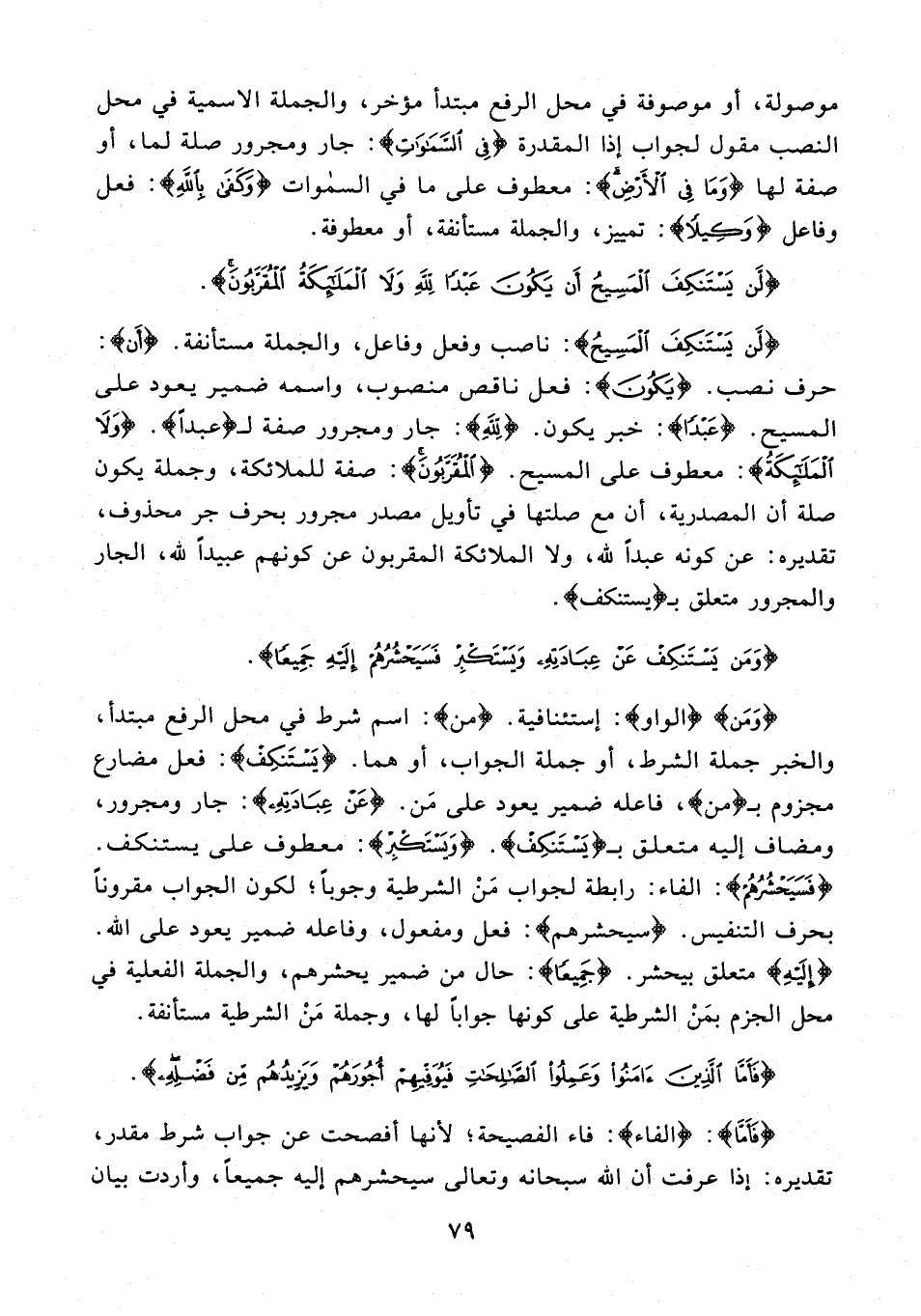 {لَنْ يَسْتَنْكِفَ الْمَسِيحُ}: ناصب وفعل وفاعل، والجملة مستأنفة. {أَنْ}: حرف نصب. {يَكُونَ}: فعل ناقص منصوب، واسمه ضمير يعود على المسيح. {عَبْدًا}: خبر يكون. {لِلَّهِ}: جار ومجرور صفة لـ {عَبْدًا}. {وَلَا الْمَلَائِكَةُ}: معطوف على المسيح. {الْمُقَرَّبُونَ}: صفة للملائكة، وجملة يكون صلة أن المصدرية، أن مع صلتها في تأويل مصدر مجرور بحرف جر محذوف، تقديره: عن كونه عبدًا لله، ولا الملائكة المقربون عن كونهم عبيدًا لله، الجار والمجرور متعلق بـ {يَسْتَنْكِفْ}.