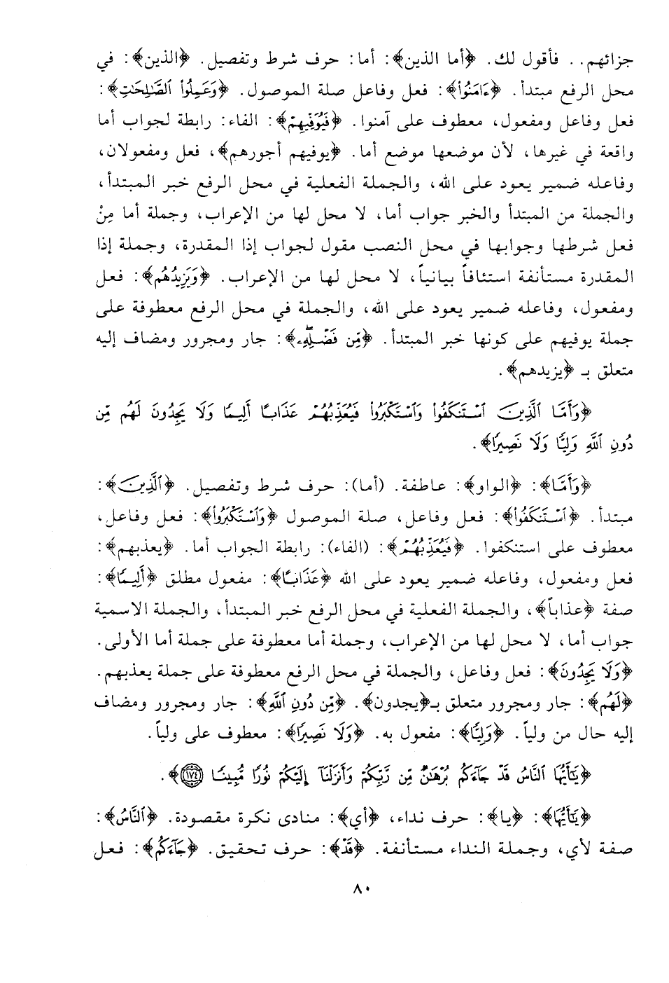 جزائهم .. فأقول لك. {أَمَّا الَّذِينَ}: أما: حرف شرط وتفصيل. {الَّذِينَ}: في محل الرفع مبتدأ. {آمَنُوا}: فعل وفاعل صلة الموصول. {وَعَمِلُوا الصَّالِحَاتِ}: فعل وفاعل ومفعول، معطوف على آمنوا. {فَيُوَفِّيهِمْ}: الفاء: رابطة لجواب أما واقعة في غيرها، لأن موضعها موضع أما. {فَيُوَفِّيهِمْ أُجُورَهُمْ}، فعل ومفعولان، وفاعله ضمير يعود على الله، والجملة الفعلية في محل الرفع خبر المبتدأ، والجملة من المبتدأ والخبر جواب أما، لا محل لها من الإعراب، وجملة أما مِنْ فعل شرطها وجوابها في محل النصب مقول لجواب إذا المقدرة، وجملة إذا المقدرة مستأنفة استئنافًا بيانيًّا، لا محل لها من الإعراب. {وَيَزِيدُهُمْ}: فعل ومفعول، وفاعله ضمير يعود على الله، والجملة في محل الرفع معطوفة على جملة يوفيهم على كونها خبر المبتدأ. {مِنْ فَضْلِهِ}: جار ومجرور ومضاف إليه متعلق بـ {يَزِيدُهُمْ}.