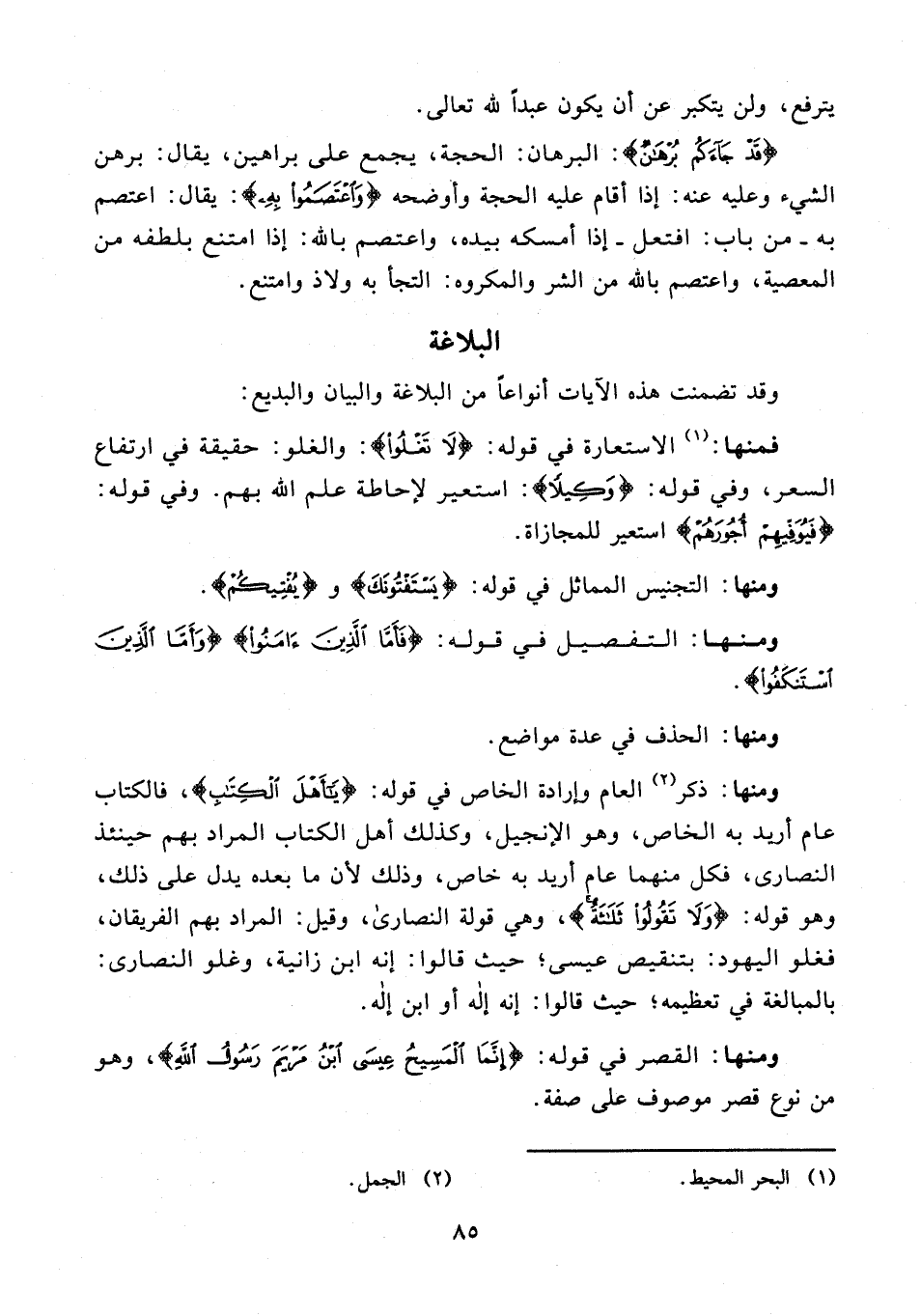 ومنها: ذكر (¬2) العام وإرادة الخاص في قوله: {يَا أَهْلَ الْكِتَابِ}، فالكتاب عام أريد به الخاص، وهو الإنجيل، وكذلك أهل الكتاب المراد بهم حينئذ النصارى، فكل منهما عام أريد به خاص، وذلك لأن ما بعده يدل على ذلك، وهو قوله: {وَلَا تَقُولُوا ثَلَاثَةٌ}، وهي قولة النصارى، وقيل: المراد بهم الفريقان، فغلو اليهود: بتنقيص عيسى؛ حيث قالوا: إنه ابن زانية، وغلو النصارى: بالمبالغة في تعظيمه؛ حيث قالوا: إنه إله أو ابن إله.