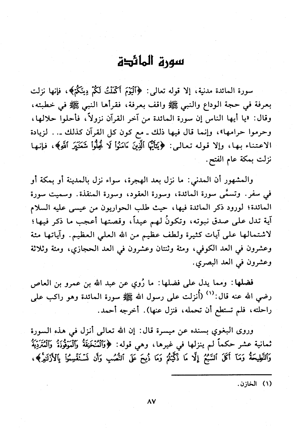 سورة المائدة مدنية، إلا قوله تعالى: {الْيَوْمَ أَكْمَلْتُ لَكُمْ دِينَكُمْ}، فإنها نزلت بعرفة في حجة الوداع والنبي - صلى الله عليه وسلم - واقف بعرفة، فقرأها النبي - صلى الله عليه وسلم - في خطبته، وقال: "يا أيها الناس إن سورة المائدة من آخر القرآن نزولًا، فأحلوا حلالها، وحرموا حرامها"، وإنما قال فيها ذلك - مع كون كل القرآن كذلك - .. لزيادة الاعتناء بها، وإلا قوله تعالى: {يَا أَيُّهَا الَّذِينَ آمَنُوا لَا تُحِلُّوا شَعَائِرَ اللَّهِ}، فإنها نزلت بمكة عام الفتح.