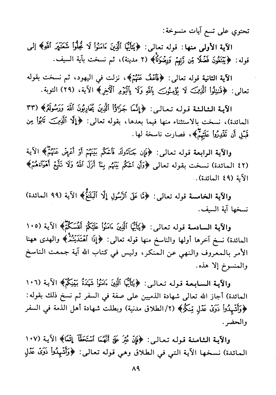 الآية الأولى منها: قوله تعالى: {يَا أَيُّهَا الَّذِينَ آمَنُوا لَا تُحِلُّوا شَعَائِرَ اللَّهِ} إلى قوله: {يَبْتَغُونَ فَضْلًا مِنْ رَبِّهِمْ وَرِضْوَانًا} (2 مدينة)، ثم نسخت بآية السيف.