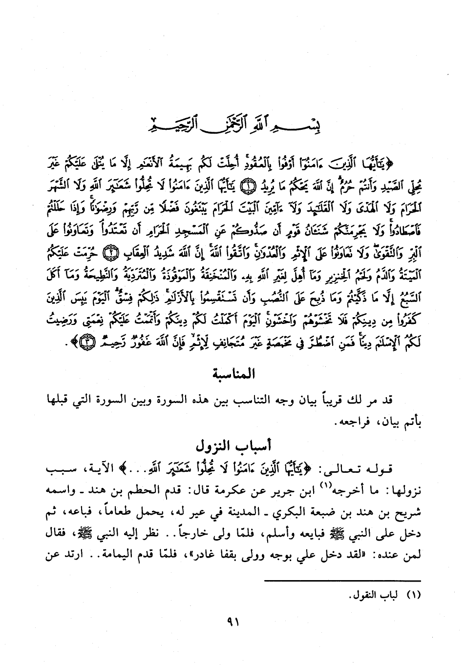 {يَا أَيُّهَا الَّذِينَ آمَنُوا أَوْفُوا بِالْعُقُودِ أُحِلَّتْ لَكُمْ بَهِيمَةُ الْأَنْعَامِ إِلَّا مَا يُتْلَى عَلَيْكُمْ غَيْرَ مُحِلِّي الصَّيْدِ وَأَنْتُمْ حُرُمٌ إِنَّ اللَّهَ يَحْكُمُ مَا يُرِيدُ (1) يَا أَيُّهَا الَّذِينَ آمَنُوا لَا تُحِلُّوا شَعَائِرَ اللَّهِ وَلَا الشَّهْرَ الْحَرَامَ وَلَا الْهَدْيَ وَلَا الْقَلَائِدَ وَلَا آمِّينَ الْبَيْتَ الْحَرَامَ يَبْتَغُونَ فَضْلًا مِنْ رَبِّهِمْ وَرِضْوَانًا وَإِذَا حَلَلْتُمْ فَاصْطَادُوا وَلَا يَجْرِمَنَّكُمْ شَنَآنُ قَوْمٍ أَنْ صَدُّوكُمْ عَنِ الْمَسْجِدِ الْحَرَامِ أَنْ تَعْتَدُوا وَتَعَاوَنُوا عَلَى الْبِرِّ وَالتَّقْوَى وَلَا تَعَاوَنُوا عَلَى الْإِثْمِ وَالْعُدْوَانِ وَاتَّقُوا اللَّهَ إِنَّ اللَّهَ شَدِيدُ الْعِقَابِ (2) حُرِّمَتْ عَلَيْكُمُ الْمَيْتَةُ وَالدَّمُ وَلَحْمُ الْخِنْزِيرِ وَمَا أُهِلَّ لِغَيْرِ اللَّهِ بِهِ وَالْمُنْخَنِقَةُ وَالْمَوْقُوذَةُ وَالْمُتَرَدِّيَةُ وَالنَّطِيحَةُ وَمَا أَكَلَ السَّبُعُ إِلَّا مَا ذَكَّيْتُمْ وَمَا ذُبِحَ عَلَى النُّصُبِ وَأَنْ تَسْتَقْسِمُوا بِالْأَزْلَامِ ذَلِكُمْ فِسْقٌ الْيَوْمَ يَئِسَ الَّذِينَ كَفَرُوا مِنْ دِينِكُمْ فَلَا تَخْشَوْهُمْ وَاخْشَوْنِ الْيَوْمَ أَكْمَلْتُ لَكُمْ دِينَكُمْ وَأَتْمَمْتُ عَلَيْكُمْ نِعْمَتِي وَرَضِيتُ لَكُمُ الْإِسْلَامَ دِينًا فَمَنِ اضْطُرَّ فِي مَخْمَصَةٍ غَيْرَ مُتَجَانِفٍ لِإِثْمٍ فَإِنَّ اللَّهَ غَفُورٌ رَحِيمٌ (3)}.