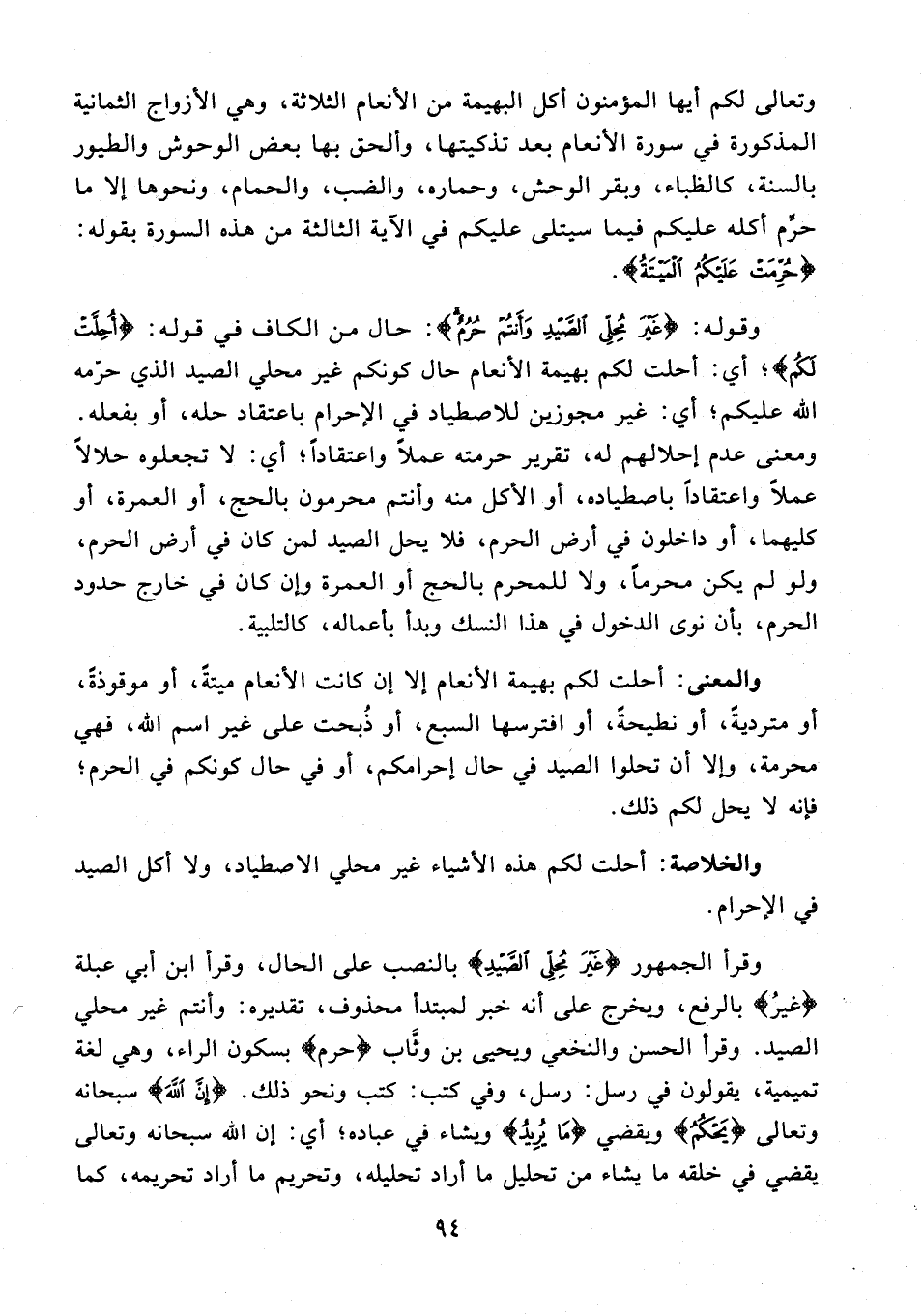 والمعنى: أحلت لكم بهيمة الأنعام إلا إن كانت الأنعام ميتةً، أو موقوذةً، أو مترديةً، أو نطيحةً، أو افترسها السبع، أو ذُبحت على غير اسم الله، فهي محرمة، وإلا أن تحلوا الصيد في حال إحرامكم، أو في حال كونكم في الحرم؛ فإنه لا يحل لكم ذلك.