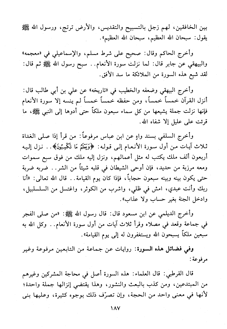 وأخرج الحاكم وقال: صحيح على شرط مسلم، والإسماعيلي في "معجمه" والبيهقي عن جابر قال: لما نزلت سورة الأنعام .. سبح رسول الله - صلى الله عليه وسلم - ثم قال: لقد شيع هذه السورة من الملائكة ما سد الأفق.