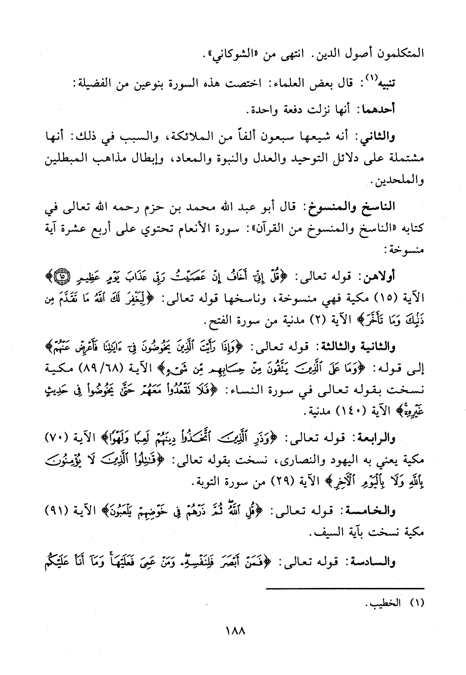 الناسخ والمنسوخ: قال أبو عبد الله محمد بن حزم رحمه الله تعالى في كتابه "الناسخ والمنسوخ من القرآن": سورة الأنعام تحتوي على أربع عشرة آية منسوخة: