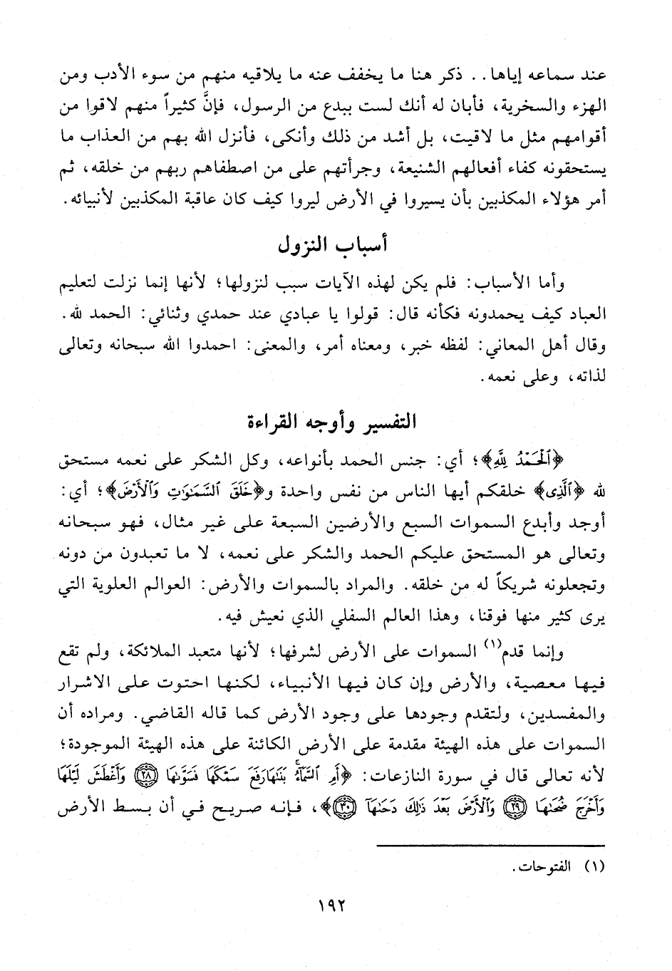 1 - {الْحَمْدُ لِلَّهِ}؛ أي: جنس الحمد بأنواعه، وكل الشكر على نعمه مستحق لله {الَّذِي} خلقكم أيها الناس من نفس واحدة و {خَلَقَ السَّمَاوَاتِ وَالْأَرْضَ}؛ أي: أوجد وأبدع السموات السبع والأرضين السبعة على غير مثال، فهو سبحانه وتعالى هو المستحق عليكم الحمد والشكر على نعمه، لا ما تعبدون من دونه وتجعلونه شريكًا له من خلقه. والمراد بالسموات والأرض: العوالم العلوية التي يرى كثير منها فوقنا، وهذا العالم السفلي الذي نعيش فيه.