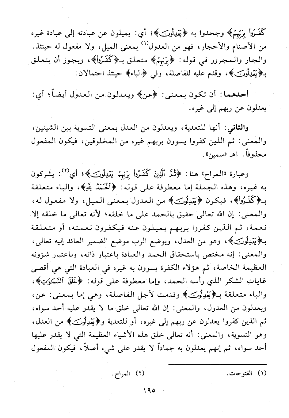 وعبارة "المراح" هنا: {ثُمَّ الَّذِينَ كَفَرُوا بِرَبِّهِمْ يَعْدِلُونَ}؛ أي (¬2): يشركون به غيره، وهذه الجملة إما معطوفة على قوله: {الْحَمْدُ لِلَّهِ}، والباء متعلقة بـ {كَفَرُوا}، فيكون {يَعْدِلُونَ} من العدول بمعنى الميل، ولا مفعول له، والمعنى: إن الله تعالى حقيق بالحمد على ما خلقه؛ لأنه تعالى ما خلقه إلا نعمة، ثم الذين كفروا بربهم يميلون عنه فيكفرون نعمته، أو متعلقة بـ {يَعْدِلُونَ}، وهو من العدل، ويوضع الرب موضع الضمير العائد إليه تعالى، والمعنى: إنه مختص باستحقاق الحمد والعبادة باعتبار ذاته، وباعتبار شؤونه العظيمة الخاصة، ثم هؤلاء الكفرة يسوون به غيره في العبادة التي هي أقصى غايات الشكر الذي رأسه الحمد، وإما معطوفة على قوله: {خَلَقَ السَّمَاوَاتِ}، والباء متعلقة بـ {يَعْدِلُونَ} وقدمت لأجل الفاصلة، وهي إما بمعنى: عن، ويعدلون من العدول، والمعنى: إن الله تعالى خلق ما لا يقدر عليه أحد سواه، ثم الذين كفروا يعدلون عن ربهم إلى غيره، أو للتعدية و {يَعْدِلُونَ} من العدل، وهو التسوية، والمعنى: أنه تعالى خلق هذه الأشياء العظيمة التي لا يقدر عليها أحد سواه، ثم إنهم يعدلون به جمادًا لا يقدر على شيء أصلًا، فيكون المفعول