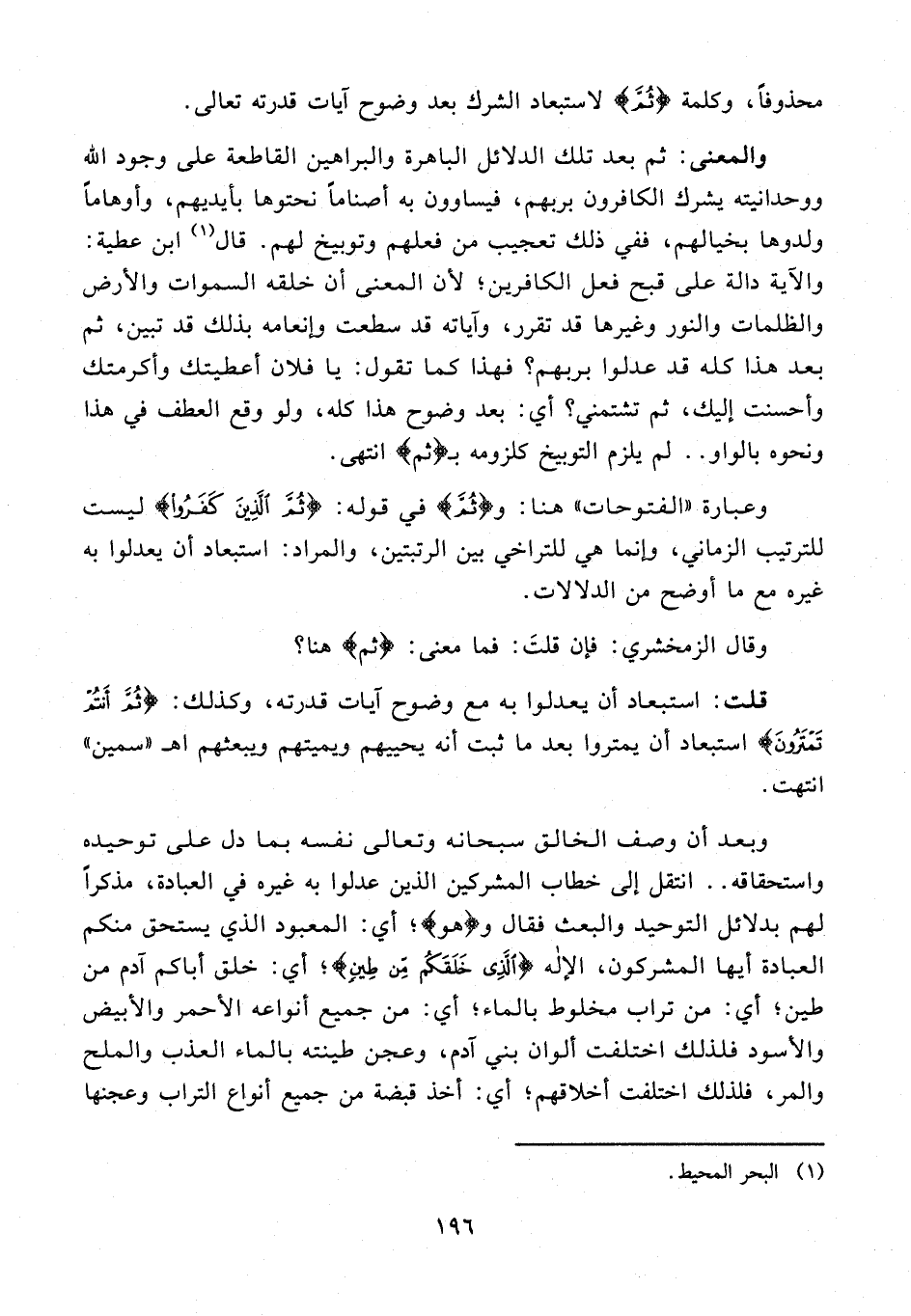 وعبارة "الفتوحات" هنا: و {ثُمَّ} في قوله: {ثُمَّ الَّذِينَ كَفَرُوا} ليست للترتيب الزماني، وإنما هي للتراخي بين الرتبتين، والمراد: استبعاد أن يعدلوا به غيره مع ما أوضح من الدلالات.
