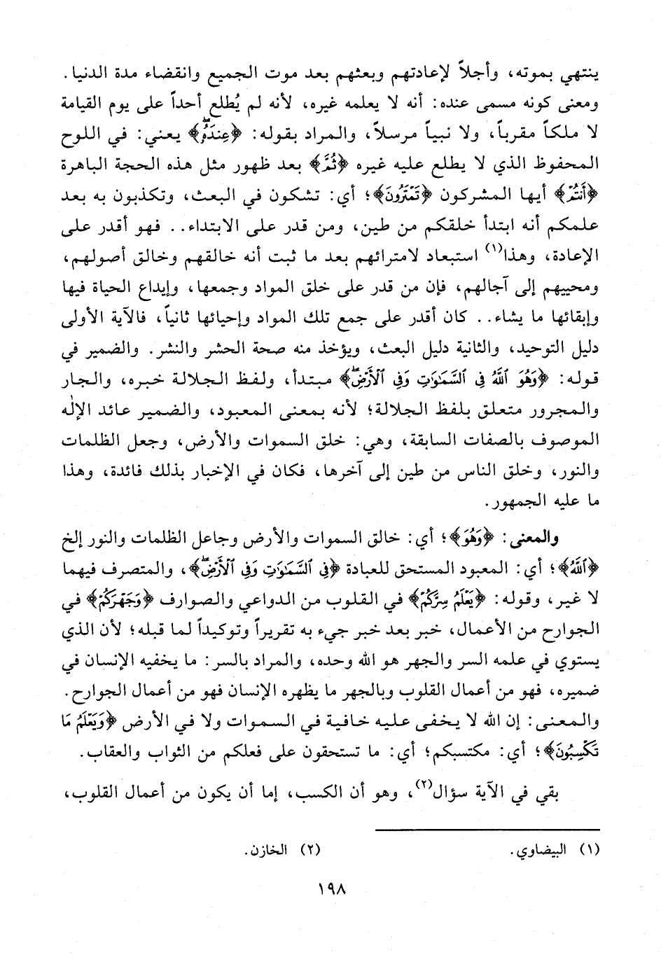 3 - والضمير في قوله: {وَهُوَ اللَّهُ فِي السَّمَاوَاتِ وَفِي الْأَرْضِ} مبتدأ، ولفظ الجلالة خبره، والجار والمجرور متعلق بلفظ الجلالة؛ لأنه بمعنى المعبود، والضمير عائد الإله الموصوف بالصفات السابقة، وهي: خلق السموات والأرض، وجعل الظلمات والنور، وخلق الناس من طين إلى آخرها، فكان في الإخبار بذلك فائدة، وهذا ما عليه الجمهور.