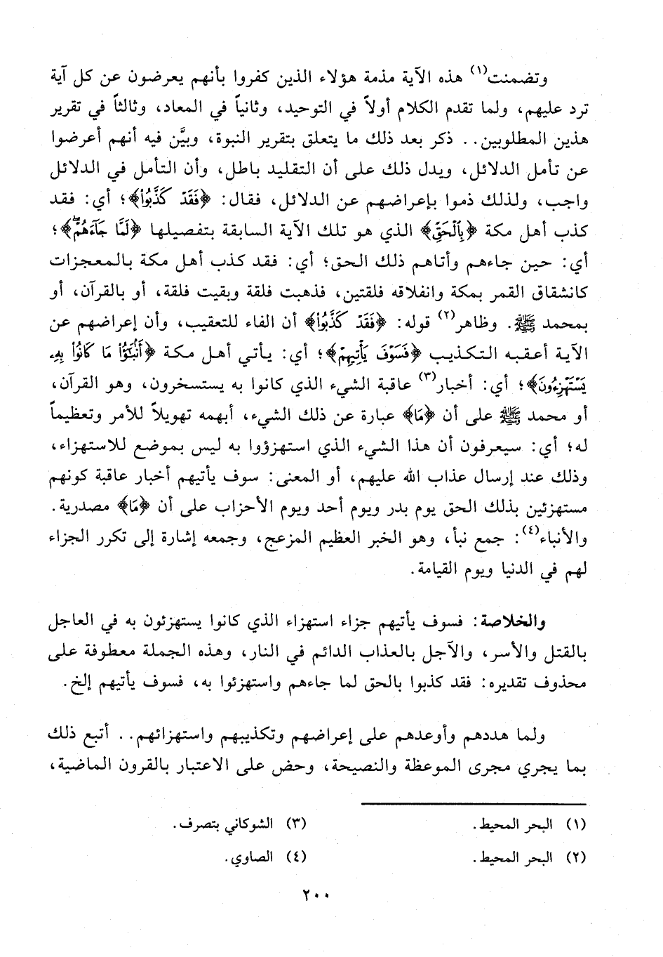 5 - ولما تقدم الكلام أولًا في التوحيد، وثانيًا في المعاد، وثالثًا في تقرير هذين المطلوبين .. ذكر بعد ذلك ما يتعلق بتقرير النبوة، وبيَّن فيه أنهم أعرضوا عن تأمل الدلائل، ويدل ذلك على أن التقليد باطل، وأن التأمل في الدلائل واجب، ولذلك ذموا بإعراضهم عن "الدلائل" فقال: {فَقَدْ كَذَّبُوا}؛ أي: فقد كذب أهل مكة {بِالْحَقِّ} الذي هو تلك الآية السابقة بتفصيلها {لَمَّا جَاءَهُمْ}؛ أي: حين جاءهم وأتاهم ذلك الحق؛ أي: فقد كذب أهل مكة بالمعجزات كانشقاق القمر بمكة وانفلاقه فلقتين، فذهبت فلقة وبقيت فلقة، أو بالقرآن، أو بمحمد - صلى الله عليه وسلم -. وظاهر (¬2) قوله: {فَقَدْ كَذَّبُوا} أن الفاء للتعقيب، وأن إعراضهم عن الآية أعقبه التكذيب {فَسَوْفَ يَأتِيهِمْ}؛ أي: يأتي أهل مكة {أَنْبَاءُ مَا كَانُوا بِهِ يَسْتَهْزِئُونَ}؛ أي: أخبار (¬3) عاقبة الشيء الذي كانوا به يستسخرون، وهو القرآن، أو محمد - صلى الله عليه وسلم - على أن {مَا} عبارة عن ذلك الشيء، أبهمه تهويلًا للأمر وتعظيمًا له؛ أي: سيعرفون أن هذا الشيء الذي استهزؤوا به ليس بموضع للاستهزاء، وذلك عند إرسال عذاب الله عليهم، أو المعنى: سوف يأتيهم أخبار عاقبة كونهم مستهزئين بذلك الحق يوم بدر ويوم أحد ويوم الأحزاب على أن {مَا} مصدرية. والأنباء (¬4): جمع نبأ، وهو الخبر العظيم المزعج، وجمعه إشارة إلى تكرر الجزاء لهم في الدنيا ويوم القيامة.