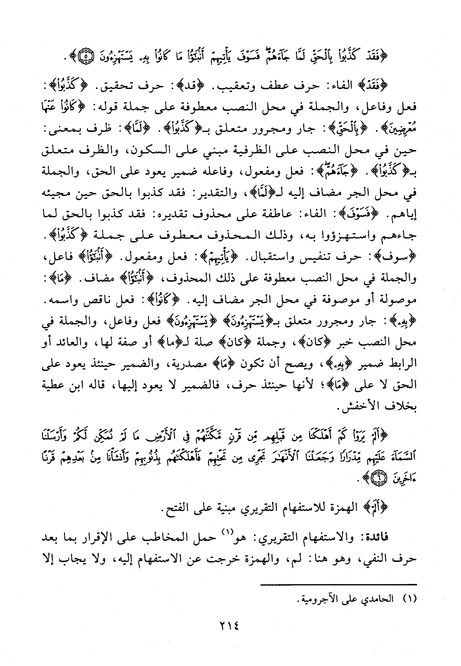 {فَقَدْ} الفاء: حرف عطف وتعقيب. {قد}: حرف تحقيق. {كَذَّبُوا}: فعل وفاعل، والجملة في محل النصب معطوفة على جملة قوله: {كَانُوا عَنْهَا مُعْرِضِينَ}. {بِالْحَقِّ}: جار ومجرور متعلق بـ {كَذَّبُوا}. {لَمَّا}: ظرف بمعنى: حين في محل النصب على الظرفية مبني على السكون، والظرف متعلق بـ {كَذَّبُوا}. {جَاءَهُمْ}: فعل ومفعول، وفاعله ضمير يعود على الحق، والجملة في محل الجر مضاف إليه لـ {لَمَّا}، والتقدير: فقد كذبوا بالحق حين مجيئه