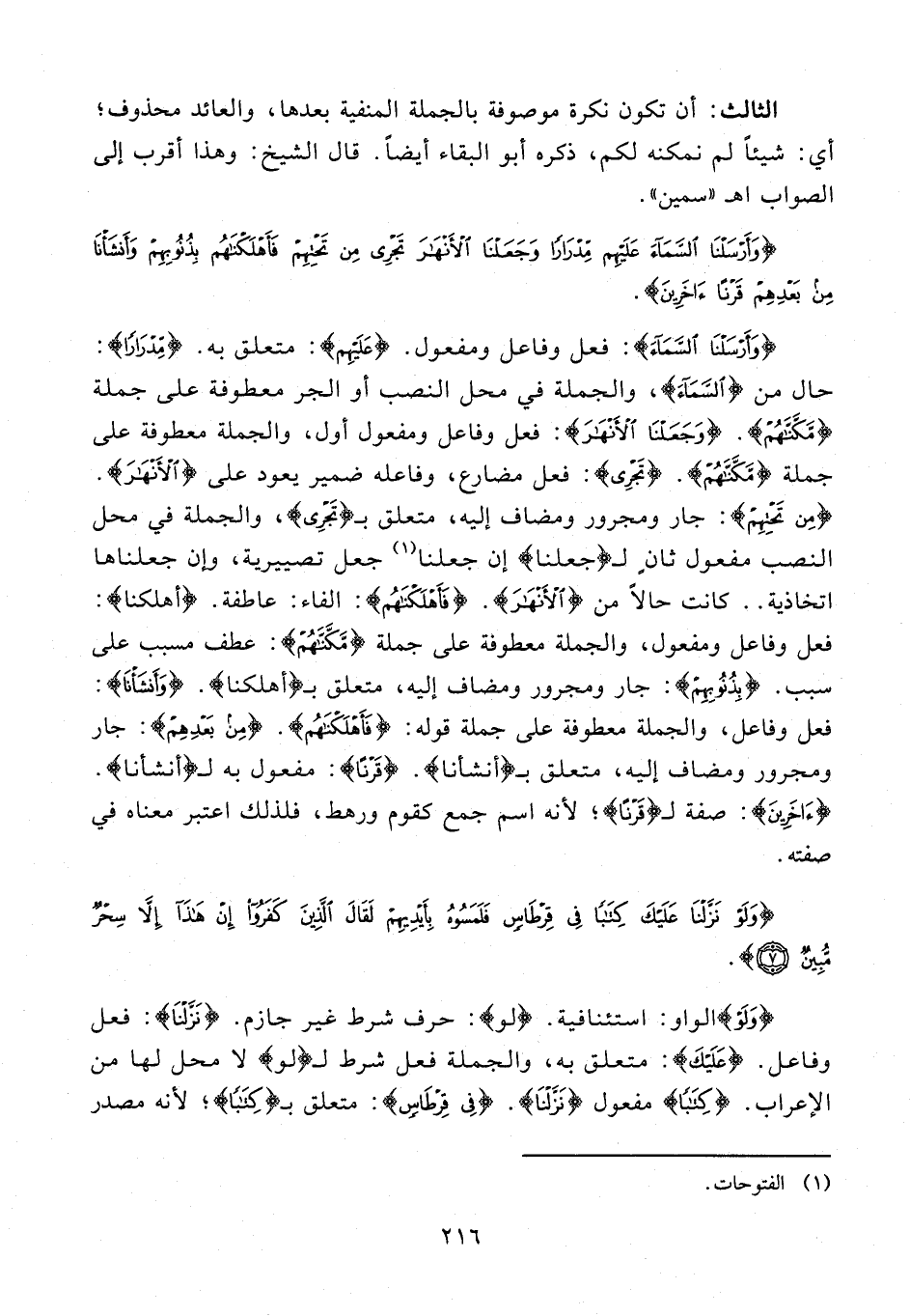 {وَأَرْسَلْنَا السَّمَاءَ}: فعل وفاعل ومفعول. {عَلَيْهِمْ}: متعلق به. {مِدْرَارًا}: حال من {السَّمَاءَ}، والجملة في محل النصب أو الجر معطوفة على جملة {مَكَّنَّاهُمْ}. {وَجَعَلْنَا الْأَنْهَارَ}: فعل وفاعل ومفعول أول، والجملة معطوفة على جملة {مَكَّنَّاهُمْ}. {تَجْرِي}: فعل مضارع، وفاعله ضمير يعود على {الْأَنْهَارَ}. {مِنْ تَحْتِهِمْ}: جار ومجرور ومضاف إليه، متعلق بـ {تَجْرِي}، والجملة في محل النصب مفعول ثان لـ {جعلنا} إن جعلنا (¬1) جعل تصييرية، وإن جعلناها اتخاذية .. كانت حالًا من {الْأَنْهَارَ}. {فَأَهْلَكْنَاهُمْ}: الفاء: عاطفة. {أهلكنا}: فعل وفاعل ومفعول، والجملة معطوفة على جملة {مَكَّنَّاهُمْ}: عطف مسبب على سبب. {بِذُنُوبِهِمْ}: جار ومجرور ومضاف إليه، متعلق بـ {أهلكنا}. {وَأَنْشَأنَا}: فعل وفاعل، والجملة معطوفة على جملة قوله: {فَأَهْلَكْنَاهُمْ}. {مِنْ بَعْدِهِمْ}: جار ومجرور ومضاف إليه، متعلق بـ {أنشأنا}. {قَرْنًا}: مفعول به لـ {أَنْشَأنَا}. {آخَرِينَ} صفة لـ {قَرْنًا}؛ لأنه اسم جمع كقوم ورهط، فلذلك اعتبر معناه في صفته.