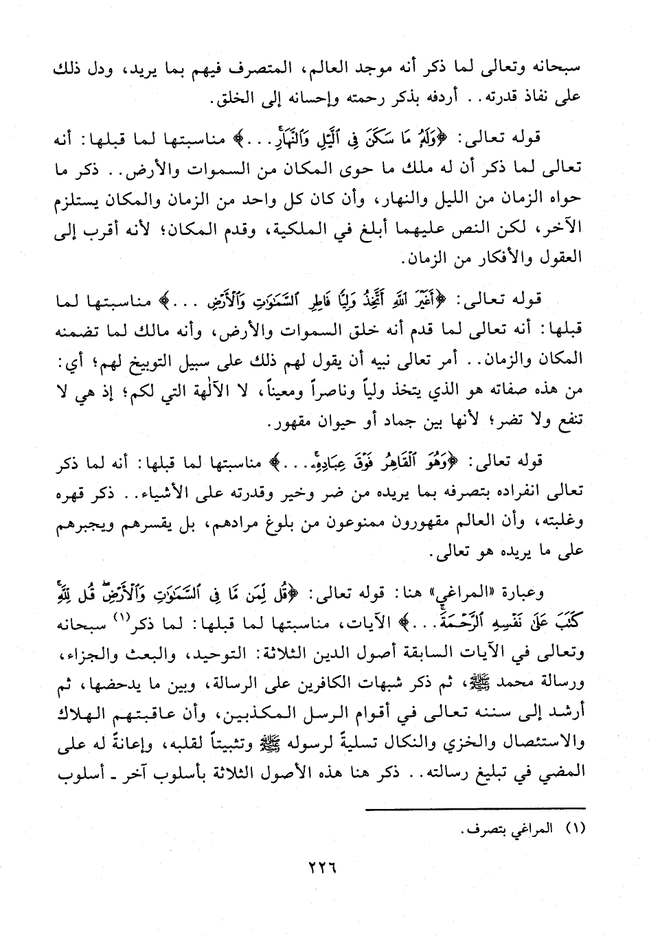 وعبارة "المراغي " هنا: قوله تعالى: {قُلْ لِمَنْ مَا فِي السَّمَاوَاتِ وَالْأَرْضِ قُلْ لِلَّهِ كَتَبَ عَلَى نَفْسِهِ الرَّحْمَةَ ...} الآيات، مناسبتها لما قبلها: لما ذكر (¬1) سبحانه وتعالى في الآيات السابقة أصول الدين الثلاثة: التوحيد، والبعث والجزاء، ورسالة محمد - صلى الله عليه وسلم -، ثم ذكر شبهات الكافرين على الرسالة، وبين ما يدحضها، ثم أرشد إلى سننه تعالى في أقوام الرسل المكذبين، وأن عاقبتهم الهلاك والاستئصال والخزي والنكال تسليةً لرسوله - صلى الله عليه وسلم - وتثبيتًا لقلبه، وإعانةً له على المضي في تبليغ رسالته .. ذكر هنا هذه الأصول الثلاثة بأسلوب آخر - أسلوب