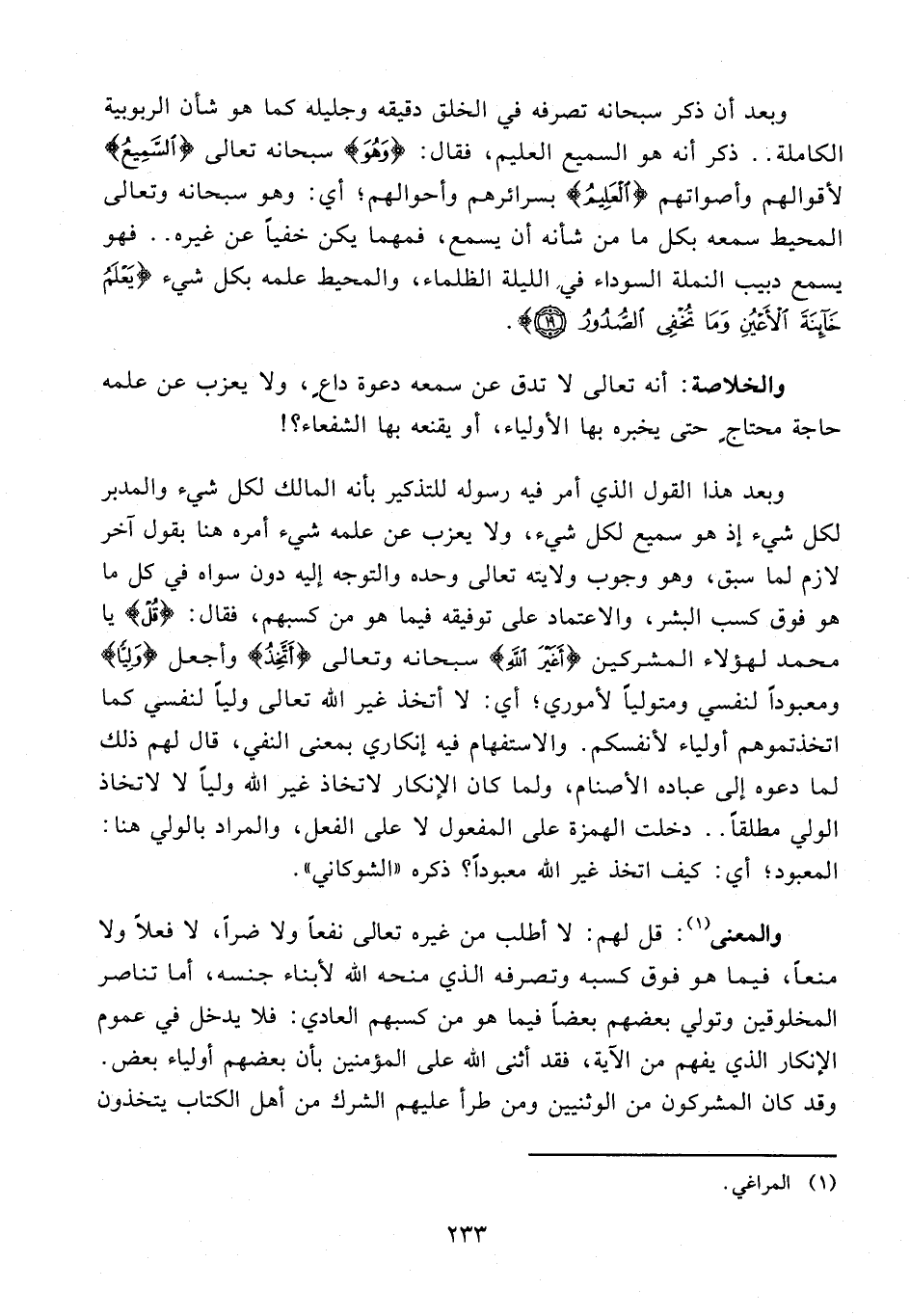 والمعنى (¬1): قل لهم: لا أطلب من غيره تعالى نفعًا ولا ضرًّا، لا فعلًا ولا منعًا، فيما هو فوق كسبه وتصرفه الذي منحه الله لأبناء جنسه، أما تناصر المخلوقين وتولي بعضهم بعضًا فيما هو من كسبهم العادي: فلا يدخل في عموم الإنكار الذي يفهم من الآية، فقد أثنى الله على المؤمنين بأن بعضهم أولياء بعض. وقد كان المشركون من الوثنيين ومن طرأ عليهم الشرك من أهل الكتاب يتخذون