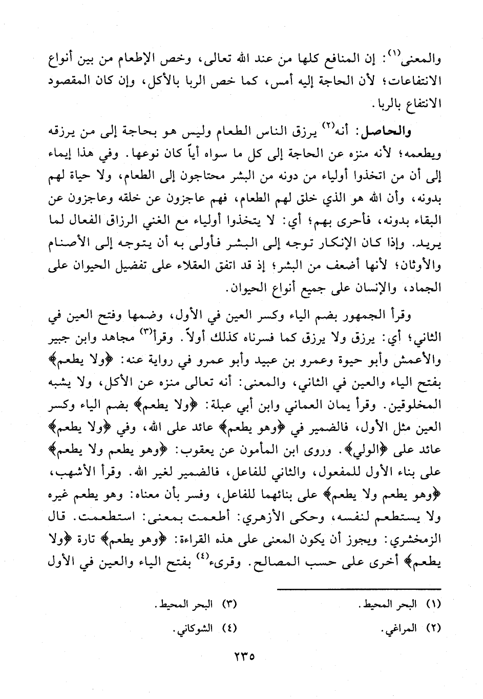 وقرأ الجمهور بضم الياء وكسر العين في الأول، وضمها وفتح العين في الثاني؛ أي: يرزق ولا يرزق كما فسرناه كذلك أولًا. وقرأ (¬3) مجاهد وابن جبير والأعمش وأبو حيوة وعمرو بن عبيد وأبو عمرو في رواية عنه: {ولا يطعم} بفتح الياء والعين في الثاني، والمعنى: أنه تعالى منزه عن الأكل، ولا يشبه المخلوقين. وقرأ يمان العماني وابن أبي عبلة: {ولا يطعم} بضم الياء وكسر العين مثل الأول، فالضمير في {وهو يطعم} عائد على الله، وفي {ولا يطعم} عائد على {الولي}. وروى ابن المأمون عن يعقوب: {وهو يطعم ولا يطعم} علي بناء الأول للمفعول، والثاني للفاعل، فالضمير لغير الله. وقرأ الأشهب، {وهو يطعم ولا يطعم} علي بنائهما للفاعل، وفسر بأن معناه: وهو يطعم غيره ولا يستطعم لنفسه، وحكى الأزهري: أطعمت بمعنى: استطعمت. قال الزمخشري: ويجوز أن يكون المعنى على هذه القراءة: {وهو يطعم} تارة {ولا يطعم} أخرى على حسب المصالح. وقرىء (¬4) بفتح الياء والعين في الأول