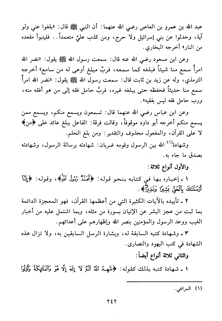 وعن ابن مسعود رضي الله عنه قال: سمعت رسول الله - صلى الله عليه وسلم - يقول: "نضر الله امرأً سمع منا شيئًا فبلغه كما سمعه، فربَّ مبلغ أوعى له من سامع" أخرجه الترمذي، وله عن زيد بن ثابت قال: سمعت رسول الله - صلى الله عليه وسلم - يقول: "نضر الله امرأً سمع منا حديثًا فحفظه حتى يبلغه غيره، فربَّ حامل فقه إلى من هو أفقه منه، ورب حامل فقه ليس بفقيه".