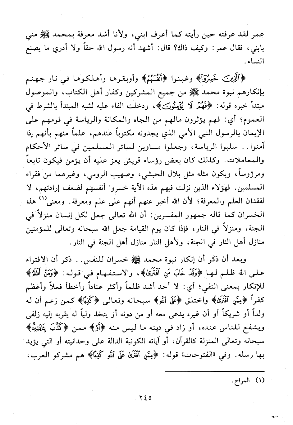 {الَّذِينَ خَسِرُوا} وغبنوا {أَنْفُسَهُمْ} وأوبقوها وأهلكوها في نار جهنم بإنكارهم نبوة محمد - صلى الله عليه وسلم - من جميع المشركين وكفار أهل الكتاب، والموصول مبتدأ خبره قوله: {فَهُمْ لَا يُؤْمِنُونَ}، ودخلت الفاء عليه لشبه المبتدأ بالشرط في العموم؛ أي: فهم يؤثرون مالهم من الجاه والمكانة والرياسة في قومهم على الإيمان بالرسول النبي الأمي الذي يجدونه مكتوبًا عندهم، علمًا منهم بأنهم إذا آمنوا .. سلبوا الرياسة، وجعلوا مساوين لسائر المسلمين في سائر الأحكام والمعاملات. وكذلك كان بعض رؤساء قريش يعز عليه أن يؤمن فيكون تابعًا ومرؤوسًا، ويكون مثله مثل بلال الحبشي، وصهيب الرومي، وغيرهما من فقراء المسلمين. فهؤلاء الذين نزلت فيهم هذه الآية خسروا أنفسهم لضعف إرادتهم، لا لفقدان العلم والمعرفة؛ لأن الله أخبر عنهم أنهم على علم ومعرفة. ومعنى (¬1) هذا الخسران كما قاله جمهور المفسرين: أن الله تعالى جعل لكل إنسان منزلًا في الجنة، ومنزلًا في النار، فإذا كان يوم القيامة جعل الله سبحانه وتعالى للمؤمنين منازل أهل النار في الجنة، ولأهل النار منازل أهل الجنة في النار.