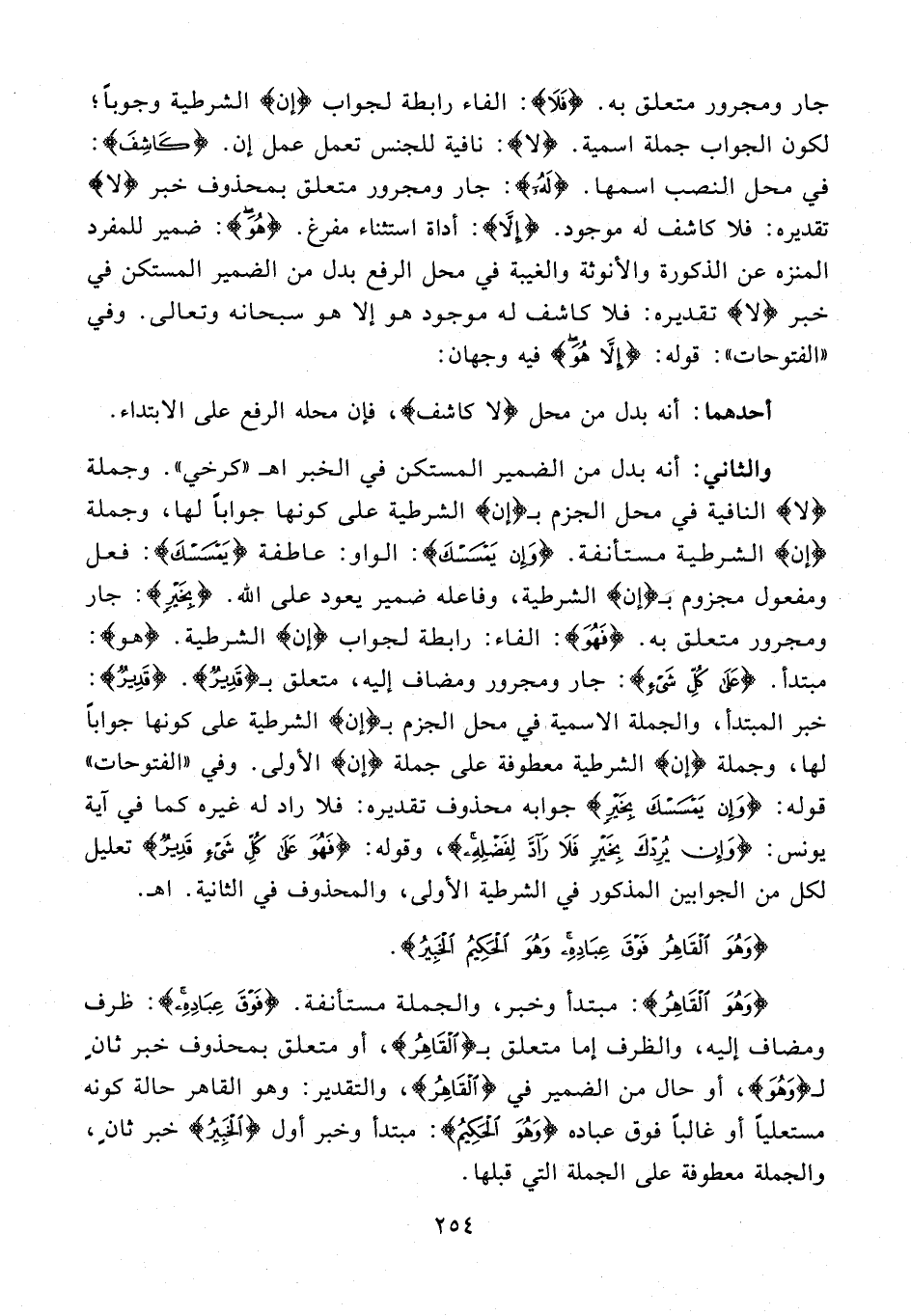 والثاني: أنه بدل من الضمير المستكن في الخبر اهـ "كرخي". وجملة {لا} النافية في محل الجزم بـ {إن} الشرطية على كونها جوابًا لها، وجملة {إن} الشرطية مستأنفة. {وَإِنْ يَمْسَسْكَ}: الواو: عاطفة {يَمْسَسْكَ}: فعل ومفعول مجزوم بـ {إن} الشرطية، وفاعله ضمير يعود على الله. {بِخَيْرٍ}: جار ومجرور متعلق به. {فَهُوَ}: الفاء: رابطة لجواب {إن} الشرطية. {هو}: مبتدأ. {عَلَى كُلِّ شَيْءٍ}: جار ومجرور ومضاف إليه، متعلق بـ {قَدِيرٌ}. {قَدِيرٌ}: خبر المبتدأ، والجملة الإسمية في محل الجزم بـ {إن} الشرطية على كونها جوابًا لها، وجملة {إن} الشرطية معطوفة على جملة {إن} الأولى. وفي "الفتوحات" قوله: {وَإِنْ يَمْسَسْكَ بِخَيْرٍ} جوابه محذوف تقديره: فلا راد له غيره كما في آية يونس: {وَإِنْ يُرِدْكَ بِخَيْرٍ فَلَا رَادَّ لِفَضْلِهِ}، وقوله: {فَهُوَ عَلَى كُلِّ شَيْءٍ قَدِيرٌ} تعليل لكل من الجوابين المذكور في الشرطية الأولى، والمحذوف في الثانية. اهـ.