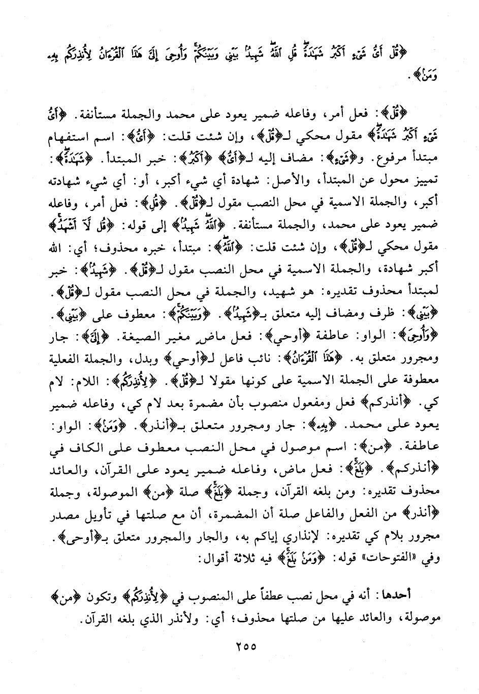 {قُلْ} فعل أمر، وفاعله ضمير يعود على محمد والجملة مستأنفة. {أَيُّ شَيْءٍ أَكْبَرُ شَهَادَةً} مقول محكي لـ {قُلْ}، وإن شئت قلت: {أَيُّ}: اسم استفهام مبتدأ مرفوع. و {شَيْءٍ}: مضاف إليه لـ {أَيُّ} {أَكْبَرُ}: خبر المبتدأ. {شَهَادَةً}: تمييز محول عن المبتدأ، والأصل: شهادة أي شيء أكبر، أو: أي شيء شهادته أكبر، والجملة الإسمية في محل النصب مقول لـ {قُلْ}. {قُلْ}: فعل أمر، وفاعله ضمير يعود على محمد، والجملة مستأنفة. {اللَّهُ شَهِيدٌ} إلى قوله: {قُلِ اللَّهُ شَهِيدٌ} مقول محكي لـ {قُلِ}، وإن شئت قلت: {اللَّهُ}: مبتدأ، خبره محذوف؛ أي: الله أكبر شهادة، والجملة الإسمية في محل النصب مقول لـ {قُلِ}. {شَهِيدٌ}: خبر لمبتدأ محذوف تقديره: هو شهيد، والجملة في محل النصب مقول لي {قُلِ}. {بَيْنِي}: ظرف ومضاف إليه متعلق بـ {شَهِيدٌ}. {وَبَيْنَكُمْ}: معطوف على {بَيْنِي}. {وَأُوحِيَ}: الواو: عاطفة {أوحي}: فعل ماضٍ مغير الصيغة. {إِلَيَّ}: جار ومجرور متعلق به. {هَذَا الْقُرْآنُ}: نائب فاعل لـ {أوحي} وبدل، والجملة الفعلية معطوفة على الجملة الإسمية على كونها مقولا لـ {قُلْ}. {لِأُنْذِرَكُمْ}: اللام: لام كي. {أنذركم} فعل ومفعول منصوب بأن مضمرة بعد لام كي، وفاعله ضمير يعود على محمد. {بِهِ}: جار ومجرور متعلق بـ {أنذر}. {وَمَنْ}: الواو: عاطفة. {من}: اسم موصول في محل النصب معطوف على الكاف في {أنذركم}. {بَلَغَ}: فعل ماض، وفاعله ضمير يعود على القرآن، والعائد محذوف تقديره: ومن بلغه القرآن، وجملة {بَلَغَ} صلة {من} الموصولة، وجملة {أنذر} من الفعل والفاعل صلة أن المضمرة، أن مع صلتها في تأويل مصدر مجرور بلام كي تقديره: لإنذاري إياكم به، والجار والمجرور متعلق بـ {أوحى}. وفي "الفتوحات" قوله: {وَمَنْ بَلَغَ} فيه ثلاثة أقوال: