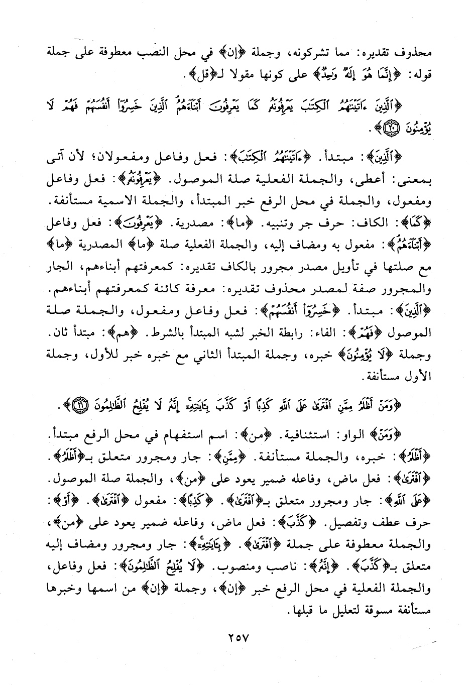 {الَّذِينَ}: مبتدأ. {آتَيْنَاهُمُ الْكِتَابَ}: فعل وفاعل ومفعولان؛ لأن آتى بمعنى: أعطى، والجملة الفعلية صلة الموصول. {يَعْرِفُونَهُ}: فعل وفاعل ومفعول، والجملة في محل الرفع خبر المبتدأ، والجملة الإسمية مستأنفة. {كَمَا}: الكاف: حرف جر وتنبيه. {ما}: مصدرية. {يَعْرِفُونَ}: فعل وفاعل {أَبْنَاءَهُمُ}: مفعول به ومضاف إليه، والجملة الفعلية صلة {ما} المصدرية {ما} مع صلتها في تأويل مصدر مجرور بالكاف تقديره: كمعرفتهم أبناءهم، الجار والمجرور صفة لمصدر محذوف تقديره: معرفة كائنة كمعرفتهم أبناءهم. {الَّذِينَ}: مبتدأ. {خَسِرُوا أَنْفُسَهُمْ}: فعل وفاعل ومفعول، والجملة صلة الموصول {فَهُمْ}: الفاء: رابطة الخبر لشبه المبتدأ بالشرط. {هم}: مبتدأ ثان. وجملة {لَا يُؤْمِنُونَ} خبره، وجملة المبتدأ الثاني مع خبره خبر للأول، وجملة الأول مستأنفة.