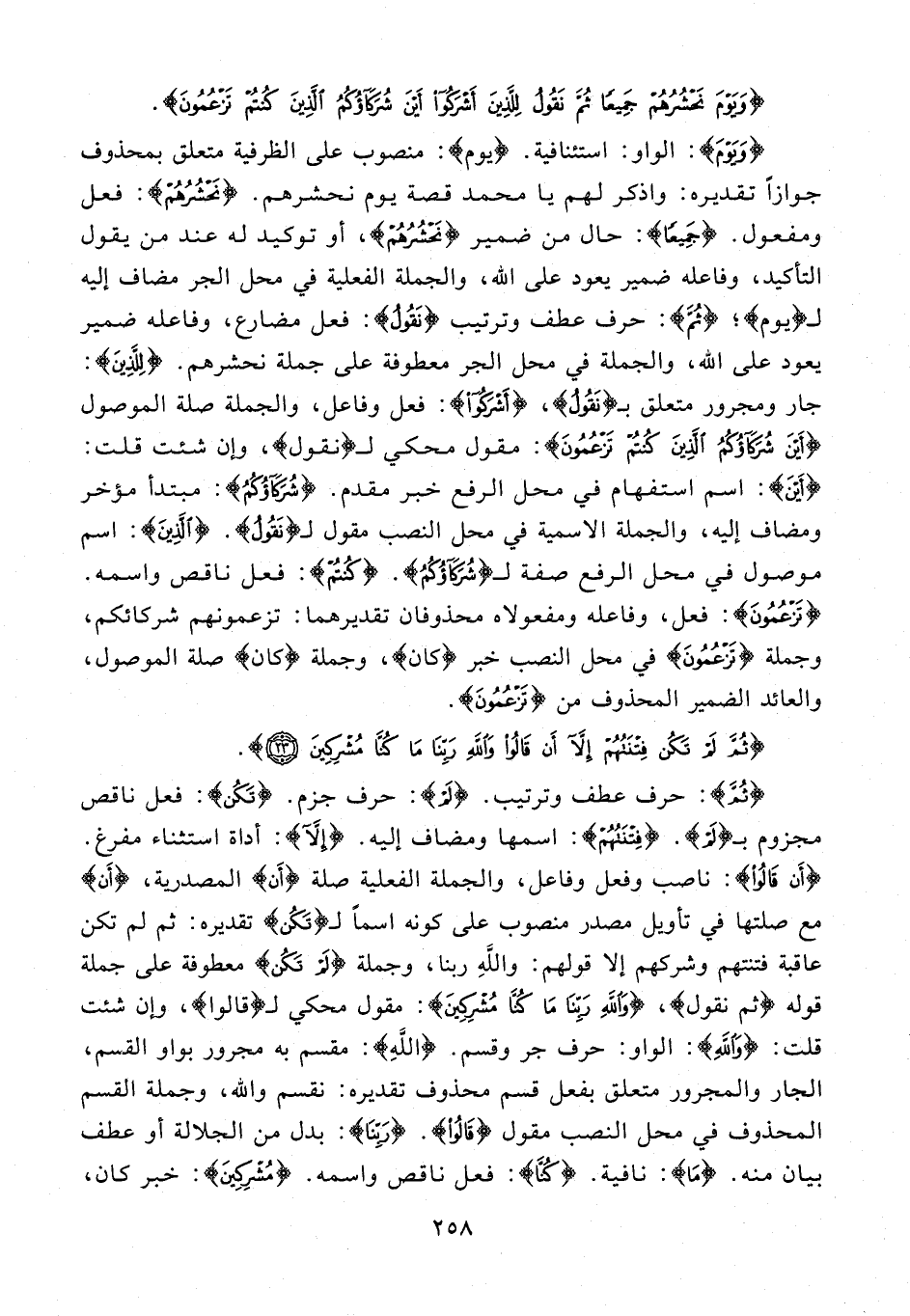 {ثُمَّ}: حرف عطف وترتيب. {لَمْ}: حرف جزم. {تَكُنْ}: فعل ناقص مجزوم بـ {لَمْ}. {فِتْنَتُهُمْ}: اسمها ومضاف إليه. {إِلَّا}: أداة استثناء مفرغ. {أَنْ قَالُوا}: ناصب وفعل وفاعل، والجملة الفعلية صلة {أَن} المصدرية، {أَن} مع صلتها في تأويل مصدر منصوب على كونه اسمًا لـ {تَكُنْ} تقديره: ثم لم تكن عاقبة فتنتهم وشركهم إلا قولهم: واللهِ ربنا، وجملة {لَمْ تَكُنْ} معطوفة على جملة قوله {ثم نقول}، {وَاللهِ رَبِّنَا مَا كُنَّا مُشْرِكِينَ}: مقول محكي لـ {قالوا} وإن شئت قلت: {وَاللهِ}: الواو: حرف جر وقسم. {اللهِ}: مقسم به مجرور بواو القسم، الجار والمجرور متعلق بفعل قسم محذوف تقديره: نقسم والله، وجملة القسم المحذوف في محل النصب مقول {قَالُوا}. {رَبِّنَا}: بدل من الجلالة أو عطف بيان منه. {مَا}: نافية. {كُنَّا}: فعل ناقص واسمه. {مُشْرِكِينَ}: خبر كان،