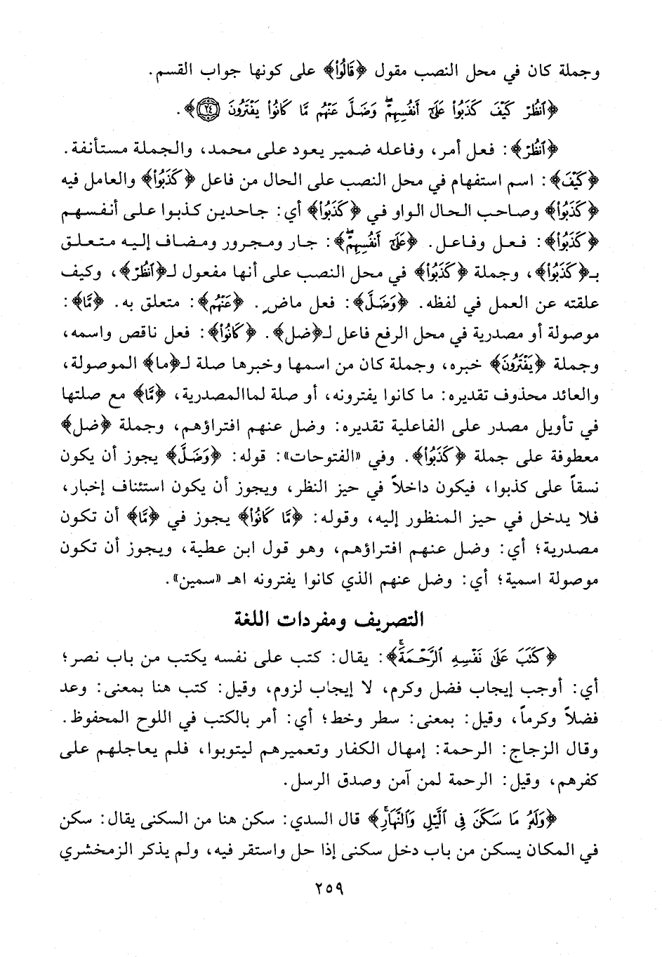 {كَتَبَ عَلَى نَفْسِهِ الرَّحْمَةَ}: يقال: كتب على نفسه يكتب من باب نصر؛ أي: أوجب إيجاب فضل وكرم، لا إيجاب لزوم، وقيل: كتب هنا بمعنى: وعد فضلًا وكرمًا، وقيل: بمعنى: سطر وخط؛ أي: أمر بالكتب في اللوح المحفوظ. وقال الزجاج: الرحمة: إمهال الكفار وتعميرهم ليتوبوا، فلم يعاجلهم على كفرهم، وقيل: الرحمة لمن آمن وصدق الرسل.