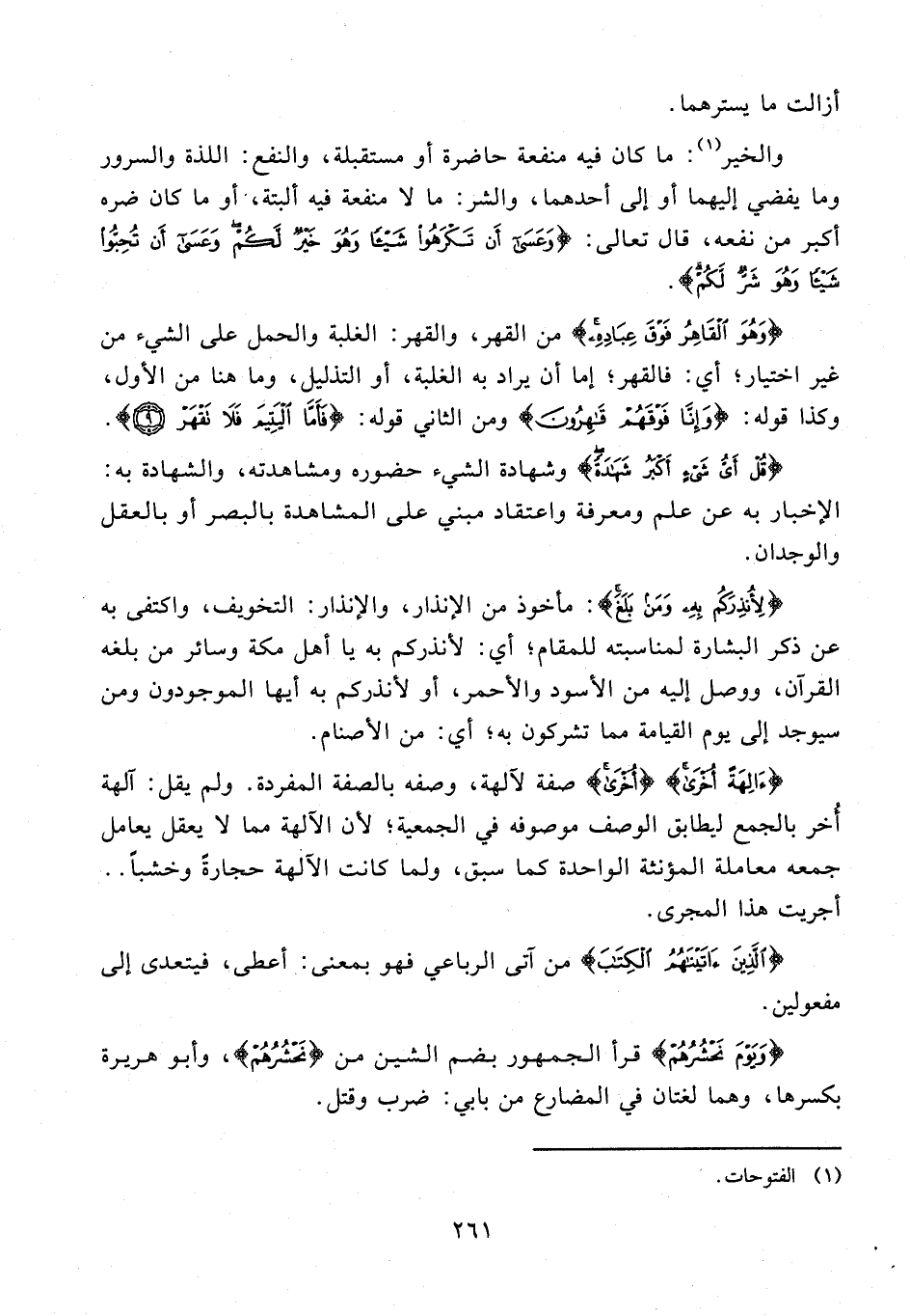 {وَهُوَ الْقَاهِرُ فَوْقَ عِبَادِهِ} من القهر، والقهر: الغلبة والحمل على الشيء من غير اختيار؛ أي: فالقهر؛ إما أن يراد به الغلبة، أو التذليل، وما هنا من الأول، وكذا قوله: {وَإِنَّا فَوْقَهُمْ قَاهِرُونَ} ومن الثاني قوله: {فَأَمَّا الْيَتِيمَ فَلَا تَقْهَرْ (9)}.