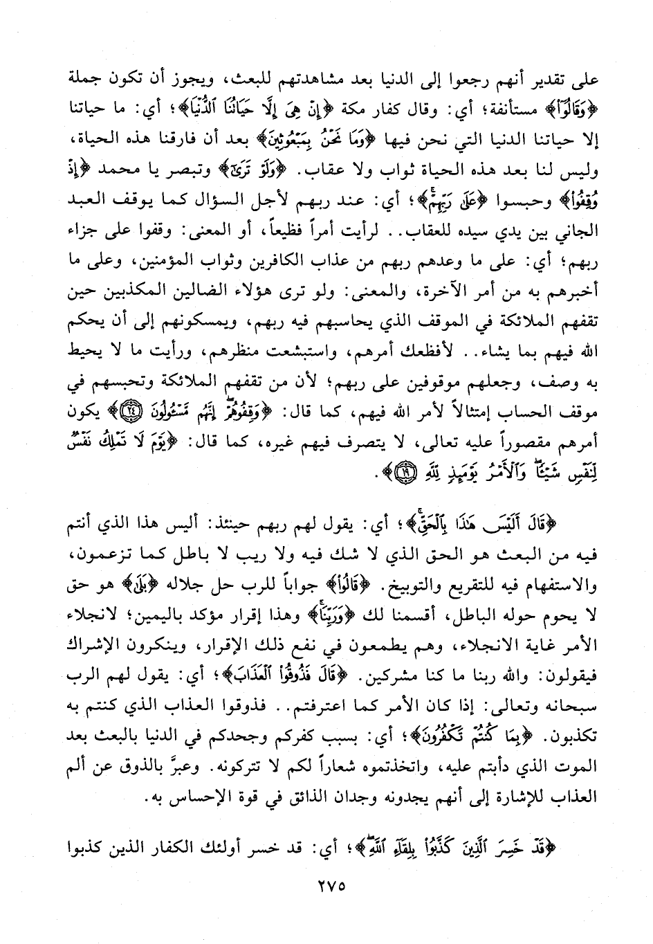 30 - {وَلَوْ تَرَى} وتبصر يا محمَّد {إِذْ وُقِفُوا} وحبسوا {عَلَى رَبِّهِمْ}؛ أي: عند ربهم لأجل السؤال كما يوقف العبد الجاني بين يدي سيده للعقاب .. لرأيت أمرًا فظيعًا، أو المعنى: وقفوا على جزاء ربهم؛ أي: على ما وعدهم ربهم من عذاب الكافرين وثواب المؤمنين، وعلى ما أخبرهم به من أمر الآخرة، والمعنى: ولو ترى هؤلاء الضالين المكذبين حين تقفهم الملائكة في الموقف الذي يحاسبهم فيه ربهم، ويمسكونهم إلى أن يحكم الله فيهم بما يشاء .. لأفظعك أمرهم، واستبشعت منظرهم، ورأيت ما لا يحيط به وصف، وجعلهم موقوفين على ربهم؛ لأن من تقفهم الملائكة وتحبسهم في موقف الحساب إمتثالًا لأمر الله فيهم، كما قال: {وَقِفُوهُمْ إِنَّهُمْ مَسْئُولُونَ (24)} يكون أمرهم مقصورًا عليه تعالى، لا يتصرف فيهم غيره، كما قال: {يَوْمَ لَا تَمْلِكُ نَفْسٌ لِنَفْسٍ شَيْئًا وَالْأَمْرُ يَوْمَئِذٍ لِلَّهِ (19)}.