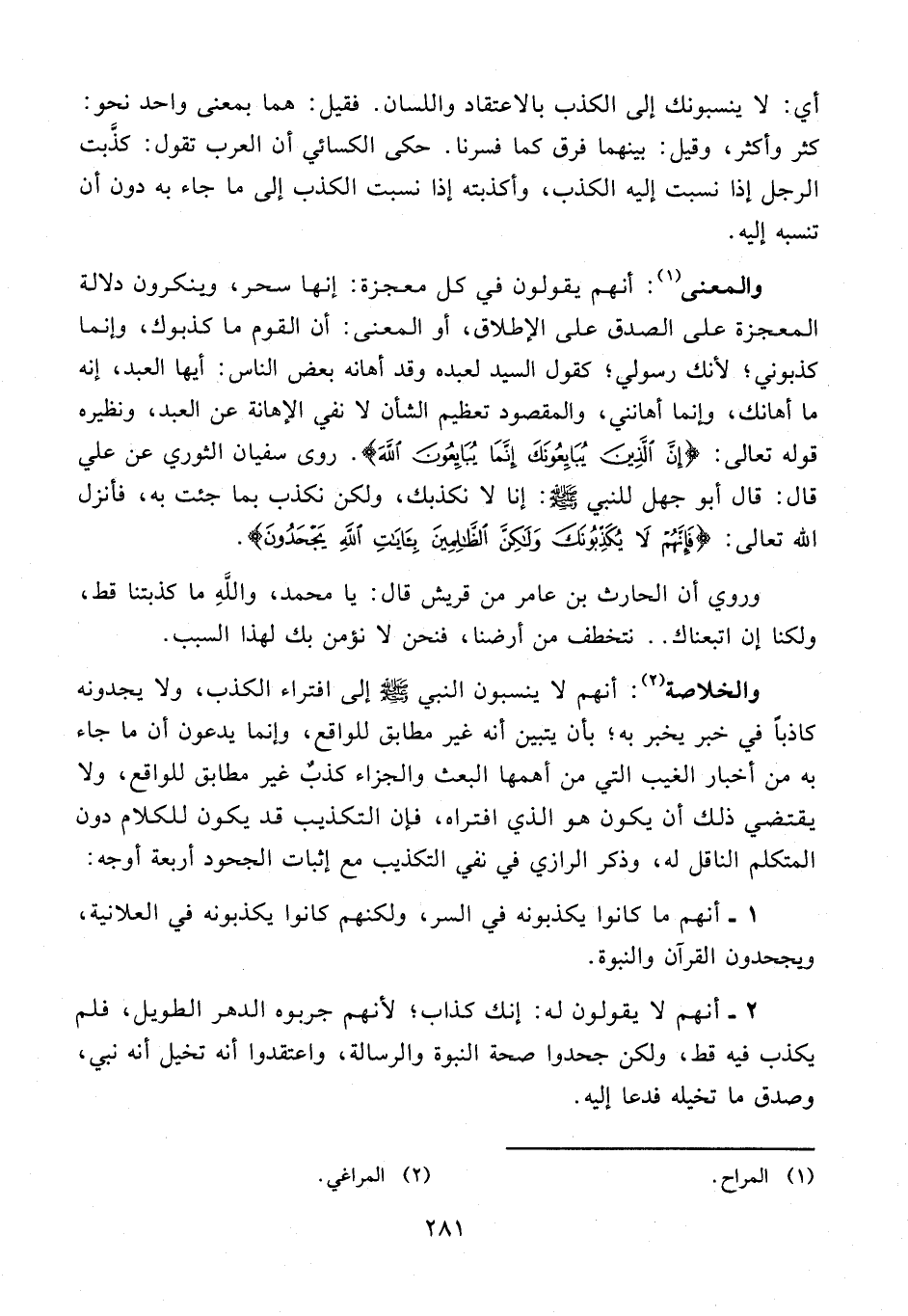 2 - أنهم لا يقولون له: إنك كذاب؛ لأنهم جربوه الدهر الطويل، فلم يكذب فيه قط، ولكن جحدوا صحة النبوة والرسالة، واعتقدوا أنه تخيل أنه نبي، وصدق ما تخيله فدعا إليه.