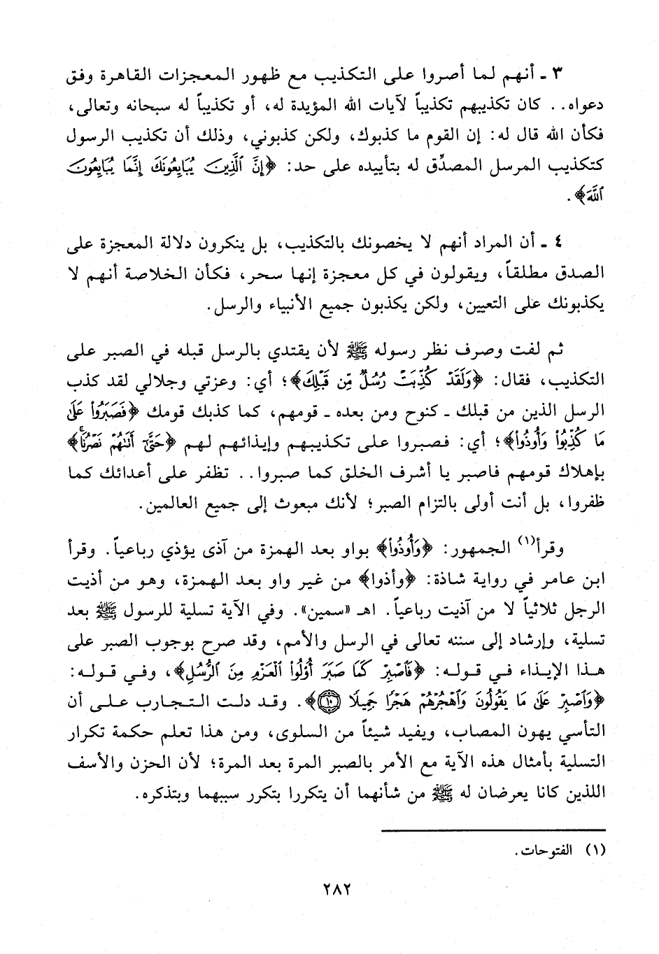 وقرأ (¬1) الجمهور: {وَأُوذُوا} بواو بعد الهمزة من آذى يؤذي رباعيًّا. وقرأ ابن عامر في رواية شاذة: {وأذوا} من غير واو بعد الهمزة، وهو من أذيت الرجل ثلاثيًّا لا من آذيت رباعيًّا. اهـ "سمين". وفي الآية تسلية للرسول - صلى الله عليه وسلم - بعد تسلية، وإرشاد إلى سننه تعالى في الرسل والأمم، وقد صرح بوجوب الصبر على هذا الإيذاء في قوله: {فَاصْبِرْ كَمَا صَبَرَ أُولُو الْعَزْمِ مِنَ الرُّسُلِ}، وفي قوله: {وَاصْبِرْ عَلَى مَا يَقُولُونَ وَاهْجُرْهُمْ هَجْرًا جَمِيلًا (10)}. وقد دلت التجارب على أن التأسي يهون المصاب، ويفيد شيئًا من السلوى، ومن هذا تعلم حكمة تكرار التسلية بأمثال هذه الآية مع الأمر بالصبر المرة بعد المرة؛ لأن الحزن والأسف اللذين كانا يعرضان له - صلى الله عليه وسلم - من شأنهما أن يتكررا بتكرر سببهما وبتذكره.