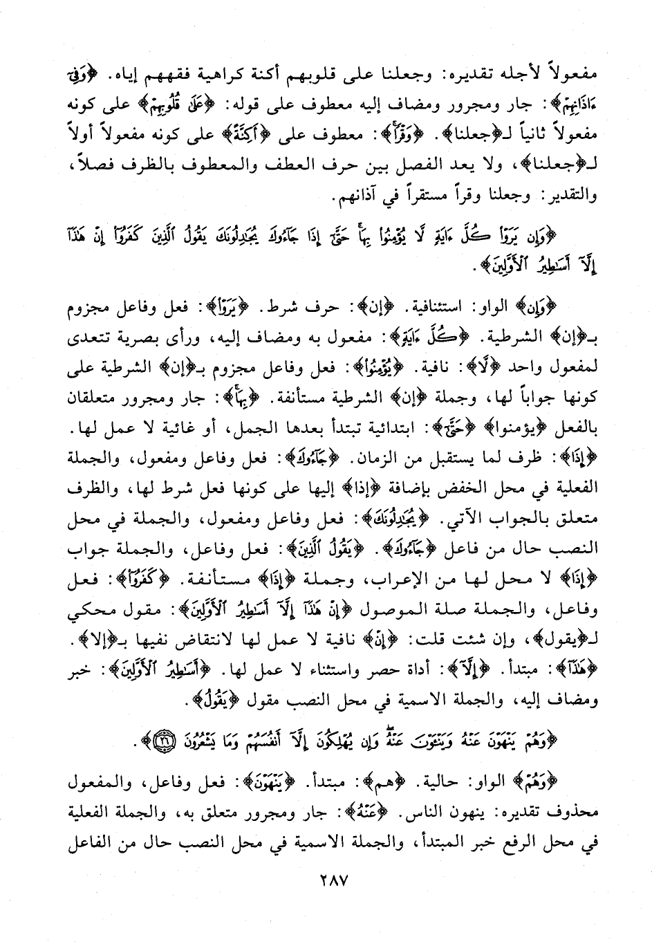 {وَإِنْ} الواو: استئنافية. {إن}: حرف شرط. (يَرَوْا}: فعل وفاعل مجزوم بـ {إن} الشرطية. {كُلَّ آيَةٍ}: مفعول به ومضاف إليه، ورأى بصرية تتعدى لمفعول واحد {لَا}: نافية. {يُؤْمِنُوا}: فعل وفاعل مجزوم بـ {إن} الشرطية على كونها جوابًا لها، وجملة {إن} الشرطية مستأنفة. {بِهَا}: جار ومجرور متعلقان بالفعل {يُؤْمِنُوا} {حَتَّى}: ابتدائية تبتدأ بعدها الجمل، أو غائية لا عمل لها. {إِذَا}: ظرف لما يستقبل من الزمان. {جَاءُوكَ}: فعل وفاعل ومفعول، والجملة الفعلية في محل الخفض بإضافة {إذا} إليها على كونها فعل شرط لها، والظرف متعلق بالجواب الآتي. {يُجَادِلُونَكَ}: فعل وفاعل ومفعول، والجملة في محل النصب حال من فاعل {جَاءُوكَ}. {يَقُولُ الَّذِينَ}: فعل وفاعل، والجملة جواب {إِذَا} لا محل لها من الإعراب، وجملة {إِذَا} مستأنفة. {كَفَرُوا}: فعل وفاعل، والجملة صلة الموصول {إِنْ هَذَا إِلَّا أَسَاطِيرُ الْأَوَّلِينَ}: مقول محكي لـ {يقول}، وإن شئت قلت: {إنْ} نافية لا عمل لها لانتقاض نفيها بـ {إلا}. {هَذَا}: مبتدأ. {إِلَّا}: أداة حصر واستثناء لا عمل لها. {أَسَاطِيرُ الْأَوَّلِينَ}: خبر ومضاف إليه، والجملة الإسمية في محل النصب مقول {يَقُولُ}.