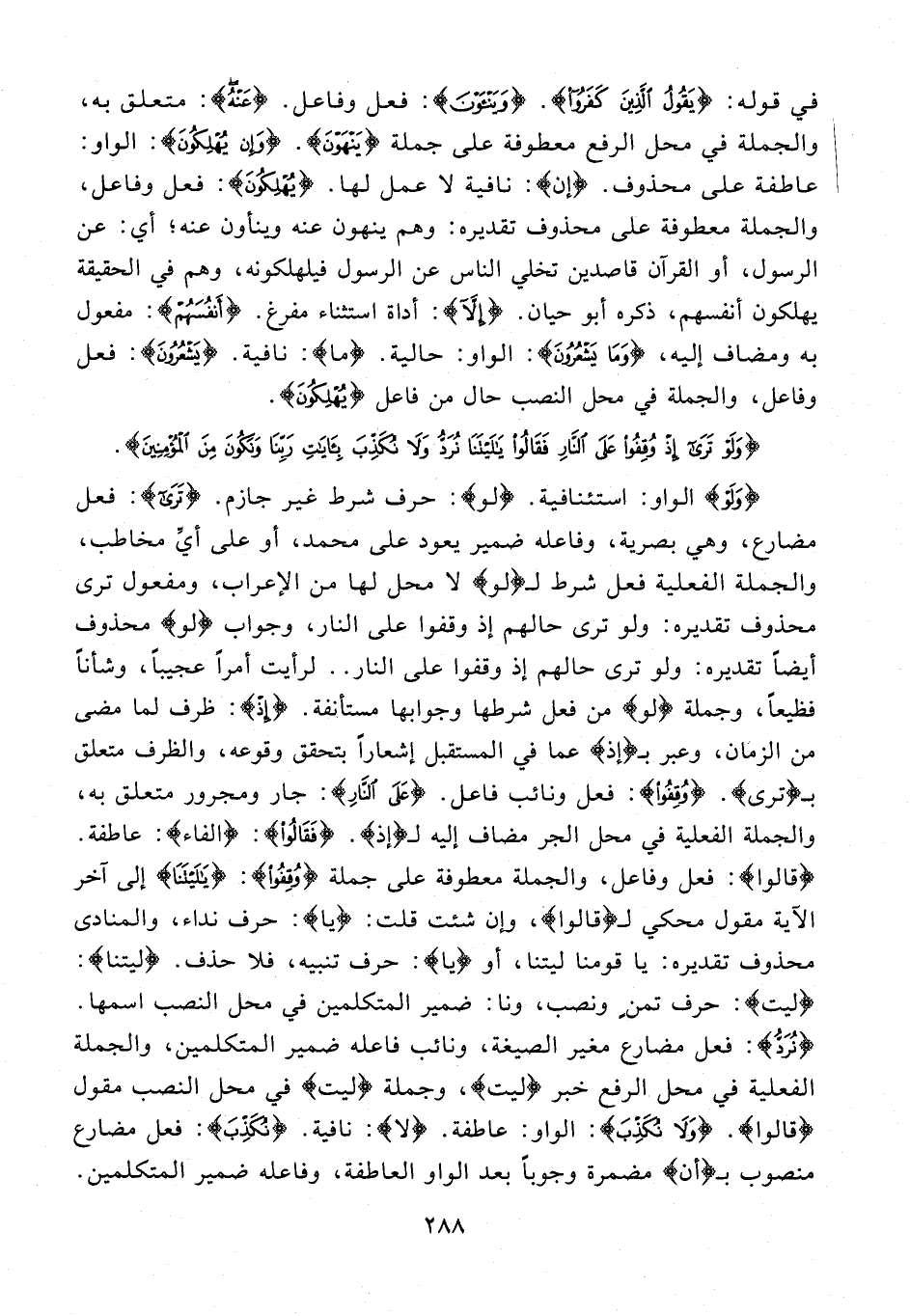 {وَلَوْ} الواو: استئنافية. {لو} حرف شرط غير جازم. {تَرَى}: فعل مضارع، وهي بصرية، وفاعله ضمير يعود على محمد، أو على أيِّ مخاطب، والجملة الفعلية فعل شرط لـ {لو} لا محل لها من الإعراب، ومفعول ترى محذوف تقديره: ولو ترى حالهم إذ وقفوا على النار، وجواب {لو} محذوف أيضًا تقديره: ولو ترى حالهم إذ وقفوا على النار .. لرأيت أمرًا عجيبًا، وشأنًا فظيعًا، وجملة {لو} من فعل شرطها وجوابها مستأنفة. {إِذْ}: ظرف لما مضى من الزمان، وعبر بـ {إذ} عما في المستقبل إشعارًا بتحقق وقوعه، والظرف متعلق بـ {ترى}. {وُقِفُوا}: فعل ونائب فاعل. {عَلَى النَّارِ}: جار ومجرور متعلق به، والجملة الفعلية في محل الجر مضاف إليه لـ {إذ}. {فَقَالُوا}: {الفاء}: عاطفة. {قالوا}: فعل وفاعل، والجملة معطوفة على جملة {وُقِفُوا}: {يَا لَيْتَنَا} إلى آخر الآية مقول محكي لـ {قالوا}، وإن شئت قلت: {يا}: حرف نداء، والمنادى محذوف تقديره: يا قومنا ليتنا، أو {يا}: حرف تنبيه، فلا حذف. {ليتنا}: {ليت}: حرف تمنٍ ونصب، ونا: ضمير المتكلمين في محل النصب اسمها. {نُرَدُّ}: فعل مضارع مغير الصيغة، ونائب فاعله ضمير المتكلمين، والجملة الفعلية في محل الرفع خبر {ليت}، وجملة {ليت} في محل النصب مقول {قالوا}. {وَلَا نُكَذِّبَ}: الواو: عاطفة. {لا}: نافية. {نُكَذِّبَ}: فعل مضارع منصوب بـ {أن} مضمرة وجوبًا بعد الواو العاطفة، وفاعله ضمير المتكلمين.