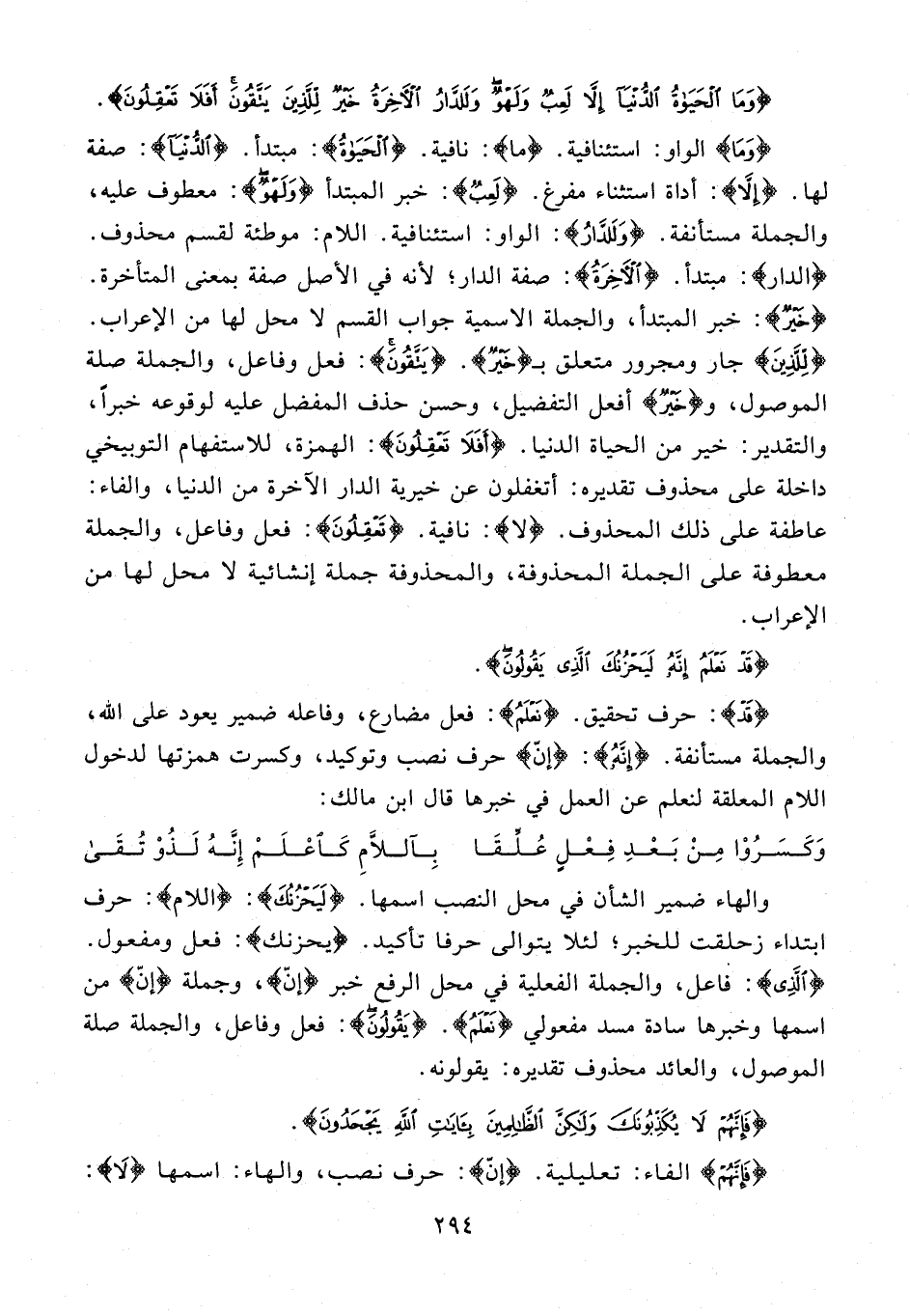 {وَمَا} الواو: استئنافية. {ما}: نافية. {الْحَيَاةُ}: مبتدأ. {الدُّنْيَا}: صفة لها. {إِلَّا}: أداة استثناء مفرغ. {لَعِبٌ}: خبر المبتدأ {وَلَهْوٌ}: معطوف عليه، والجملة مستأنفة. {وَلَلدَّارُ}: الواو: استئنافية. اللام: موطئة لقسم محذوف. {الدار}: مبتدأ. {الْآخِرَةُ}: صفة الدار؛ لأنه في الأصل صفة بمعنى المتأخرة. {خَيْرٌ}: خبر المبتدأ، والجملة الإسمية جواب القسم لا محل لها من الإعراب. {لِلَّذِينَ} جار ومجرور متعلق بـ {خَيْرٌ}. {يَتَّقُونَ}: فعل وفاعل، والجملة صلة الموصول، و {خَيْرٌ} أفعل التفضيل، وحسن حذف المفضل عليه لوقوعه خبرًا، والتقدير: خير من الحياة الدنيا. {أَفَلَا تَعْقِلُونَ}: الهمزة، للاستفهام التوبيخي داخلة على محذوف تقديره: أتغفلون عن خيرية الدار الآخرة من الدنيا، والفاء: عاطفة على ذلك المحذوف. {لا}: نافية. {تَعْقِلُونَ}: فعل وفاعل، والجملة معطوفة على الجملة المحذوفة، والمحذوفة جملة إنشائية لا محل لها من الإعراب.