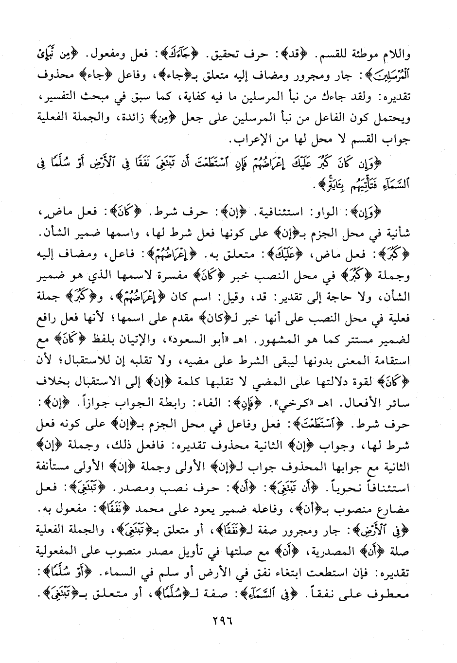 {وَإِنْ}: الواو: استئنافية. {إن}: حرف شرط. {كاَنَ}: فعل ماضٍ، شأنية في محل الجزم بـ {إن} على كونها فعل شرط لها، واسمها ضمير الشأن. {كَبُرَ}: فعل ماض، {عَلَيْكَ}: متعلق به. {إِعْرَاضُهُمْ}: فاعل، ومضاف إليه وجملة {كَبُرَ} في محل النصب خبر {كاَنَ} مفسرة لاسمها الذي هو ضمير الشأن، ولا حاجة إلى تقدير: قد، وقيل: اسم كان {إِعْرَاضُهُمْ}، و {كَبُرَ} جملة فعلية في محل النصب على أنها خبر لـ {كان} مقدم على اسمها؛ لأنها فعل رافع لضمير مستتر كما هو المشهور. اهـ "أبو السعود"، والإتيان بلفظ {كاَنَ} مع استقامة المعنى بدونها ليبقى الشرط على مضيه، ولا تقلبه إن للاستقبال؛ لأن {كَانَ} لقوة دلالتها على المضي لا تقلبها كلمة {إن} إلى الاستقبال بخلاف سائر الأفعال. اهـ "كرخي". {فَإِنِ}: الفاء: رابطة الجواب جوازًا. {إن}: حرف شرط. {اسْتَطَعْتَ}: فعل وفاعل في محل الجزم بـ {إن} على كونه فعل شرط لها، وجواب {إن} الثانية محذوف تقديره: فافعل ذلك، وجملة {إن} الثانية مع جوابها المحذوف جواب لـ {إن} الأولى وجملة {إن} الأولى مستأنفة استئنافًا نحويًّا. {أَنْ تَبْتَغِيَ}: {أَن}: حرف نصب ومصدر. {تَبْتَغِيَ}: فعل مضارع منصوب بـ {أن}، وفاعله ضمير يعود على محمد {نَفَقًا}: مفعول به. {فِي الْأَرْضِ}: جار ومجرور صفة لـ {نَفَقًا}، أو متعلق بـ {تَبْتَغِيَ}، والجملة الفعلية صلة {أَن} المصدرية، {أَن} مع صلتها في تأويل مصدر منصوب على المفعولية تقديره: فإن استطعت ابتغاء نفق في الأرض أو سلم في السماء. {أَوْ سُلَّمًا}: معطوف على نفقًا. {فِي السَّمَاءِ}: صفة لـ {سُلَّمًا}، أو متعلق بـ {تَبْتَغِيَ}.