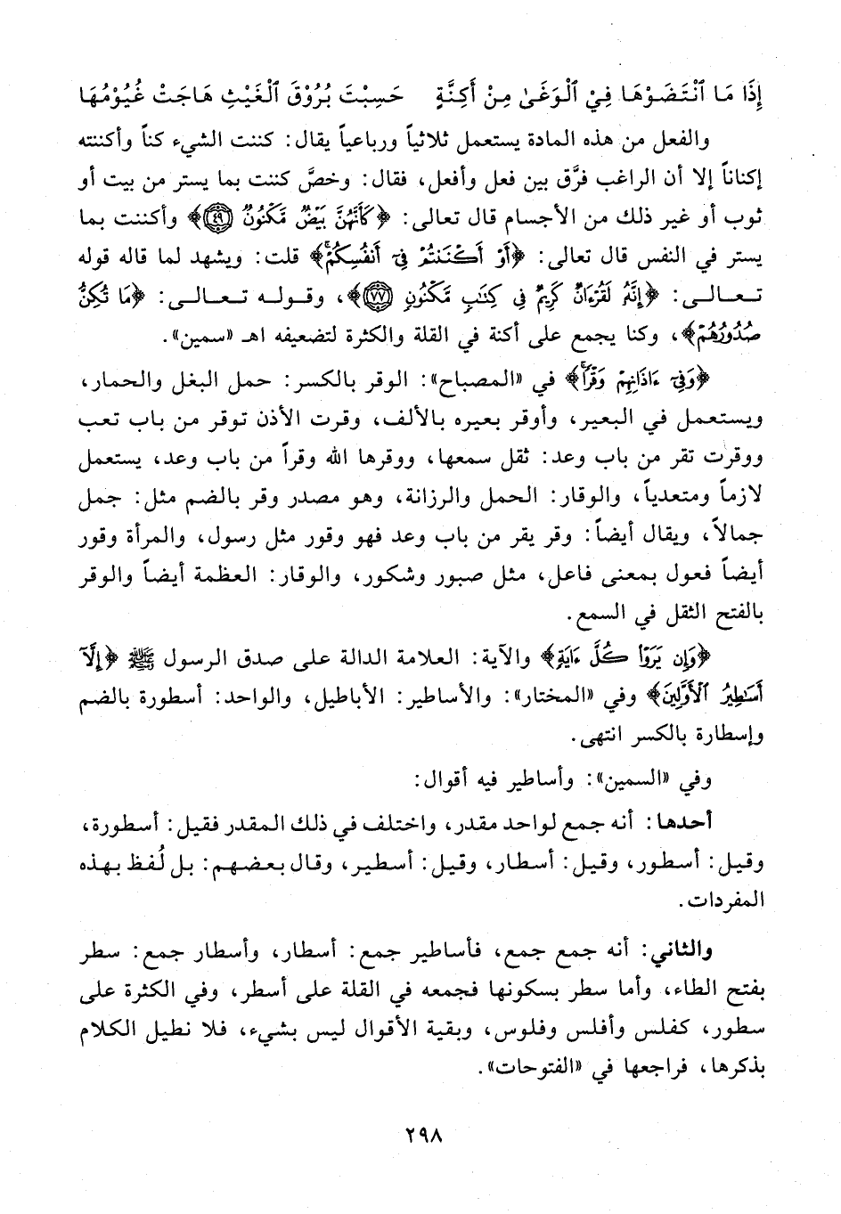 والثاني: أنه جمع جمع، فأساطير جمع: أسطار، وأسطار جمع: سطر بفتح الطاء، وأما سطر بسكونها فجمعه في القلة على أسطر، وفي الكثرة على سطور، كفلس وأفلس وفلوس، وبقية الأقوال ليس بشيء، فلا نطيل الكلام بذكرها، فراجعها في "الفتوحات".