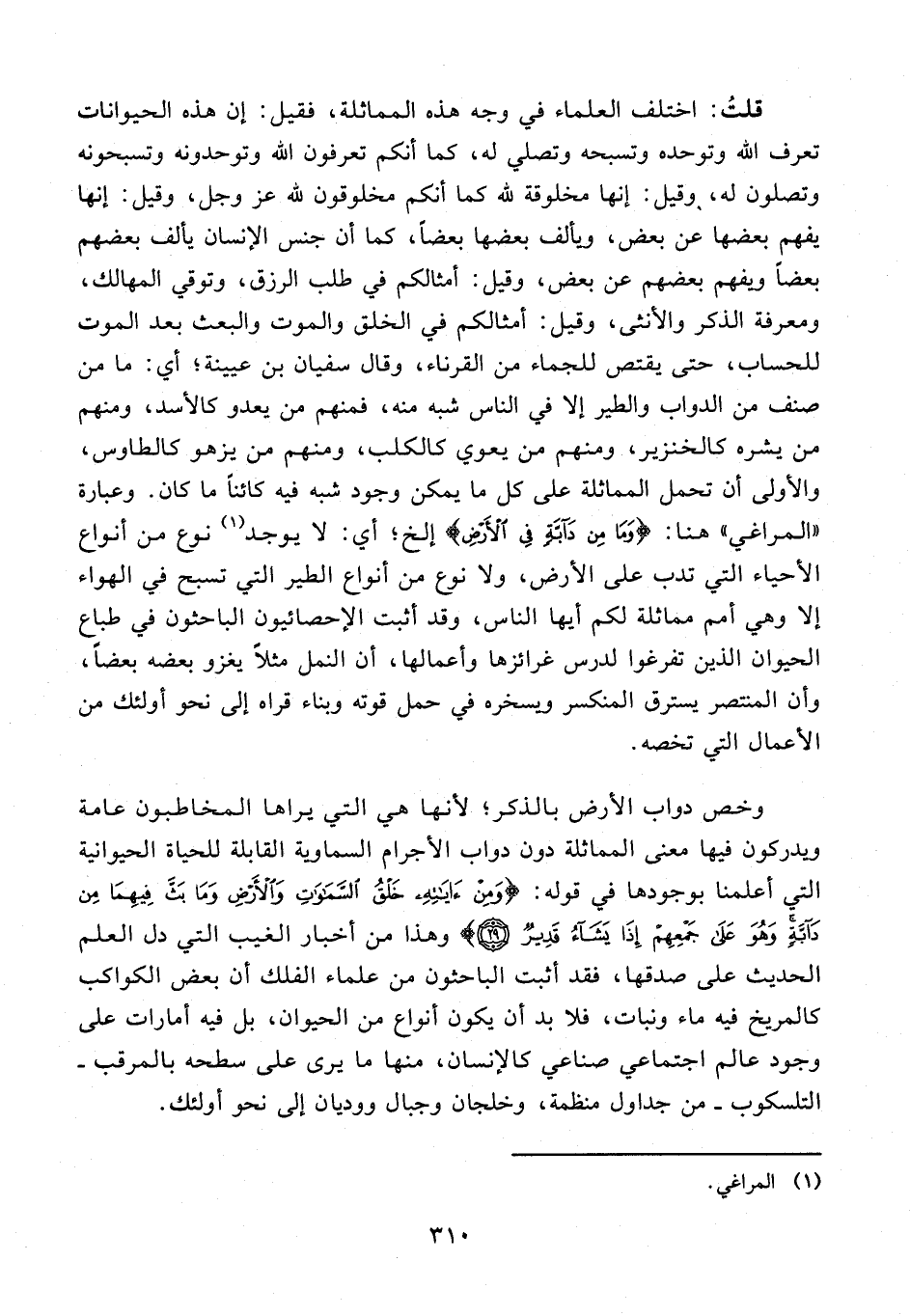 قلتُ: اختلف العلماء في وجه هذه المماثلة، فقيل: إن هذه الحيوانات تعرف الله وتوحده وتسبحه وتصلي له، كما أنكم تعرفون الله وتوحدونه وتسبحونه وتصلون له، وقيل: إنها مخلوقة لله كما أنكم مخلوقون لله عَزَّ وَجَلَّ، وقيل: إنها يفهم بعضها عن بعض، ويألف بعضها بعضًا، كما أن جنس الإنسان يألف بعضهم بعضًا ويفهم بعضهم عن بعض، وقيل: أمثالكم في طلب الرزق، وتوقي المهالك، ومعرفة الذكر والأنثى، وقيل: أمثالكم في الخلق والموت والبعث بعد الموت للحساب، حتى يقتص للجماء من القرناء، وقال سفيان بن عيينة؛ أي: ما من صنف من الدواب والطير إلا في الناس شبه منه، فمنهم من يعدو كالأسد، ومنهم من يشره كالخنزير، ومنهم من يعوي كالكلب، ومنهم من يزهو كالطاوس، والأولى أن تحمل المماثلة على كل ما يمكن وجود شبه فيه كائنًا ما كان. وعبارة "المراغي" هنا: {وَمَا مِنْ دَابَّةٍ فِي الْأَرْضِ} إلخ؛ أي: لا يوجد (¬1) نوع من أنواع الأحياء التي تدب على الأرض، ولا نوع من أنواع الطير التي تسبح في الهواء إلا وهي أمم مماثلة لكم أيها الناس، وقد أثبت الإحصائيون الباحثون في طباع الحيوان الذين تفرغوا لدرس غرائزها وأعمالها، أن النمل مثلًا يغزو بعضه بعضًا، وأن المنتصر يسترق المنكسر ويسخره في حمل قوته وبناء قراه إلى نحو أولئك من الأعمال التي تخصه.