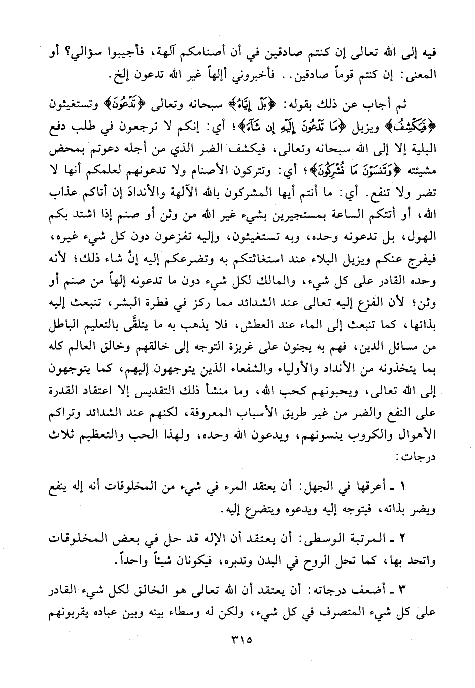 3 - أضعف درجاته: أن يعتقد أن الله تعالى هو الخالق لكل شيء القادر على كل شيء المتصرف في كل شيء، ولكن له وسطاء بينه وبين عباده يقربونهم