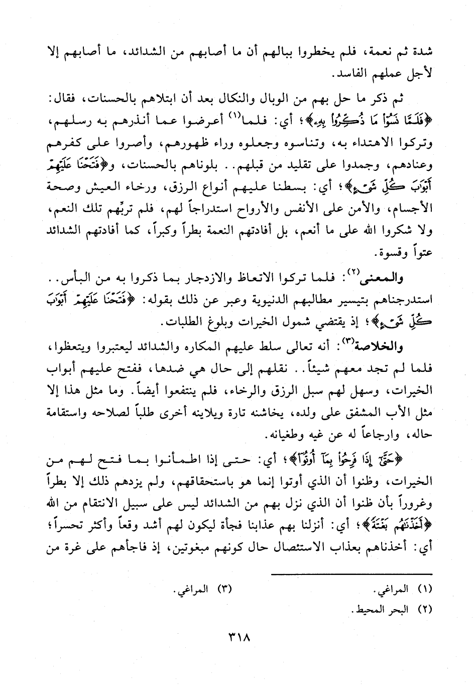 44 - ثم ذكر ما حل بهم من الوبال والنكال بعد أن ابتلاهم بالحسنات، فقال: {فَلَمَّا نَسُوا مَا ذُكِّرُوا بِهِ}؛ أي: فلما (¬1) أعرضوا عما أنذرهم به رسلهم، وتركوا الاهتداء به، وتناسوه وجعلوه وراء ظهورهم، وأصروا على كفرهم وعنادهم، وجمدوا على تقليد من قبلهم .. بلوناهم بالحسنات، و {فَتَحْنَا عَلَيْهِمْ أَبْوَابَ كُلِّ شَيْءٍ}؛ أي: بسطنا عليهم أنواع الرزق، ورخاء العيش وصحة الأجسام، والأمن على الأنفس والأرواح استدراجًا لهم، فلم تربِّهم تلك النعم، ولا شكروا الله على ما أنعم، بل أفادتهم النعمة بطرًا وكبرًا، كما أفادتهم الشدائد عتوًا وقسوة.