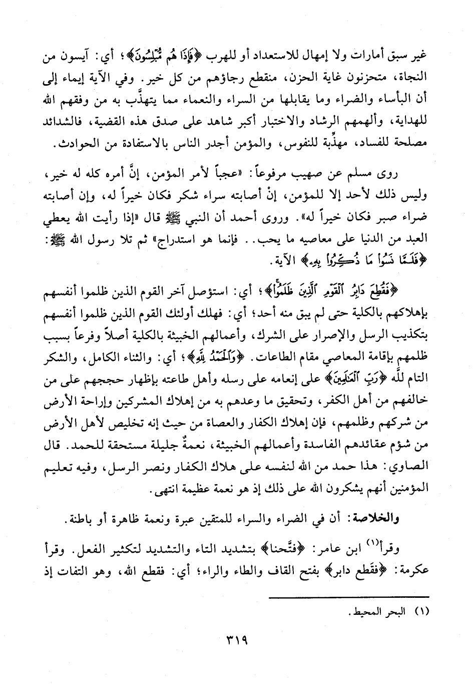 45 - {فَقُطِعَ دَابِرُ الْقَوْمِ الَّذِينَ ظَلَمُوا}؛ أي: استؤصل آخر القوم الذين ظلموا أنفسهم بإهلاكهم بالكلية حتى لم يبق منه أحد؛ أي: فهلك أولئك القوم الذين ظلموا أنفسهم بتكذيب الرسل والإصرار على الشرك، وأعمالهم الخبيثة بالكلية أصلًا وفرعًا بسبب ظلمهم بإقامة المعاصي مقام الطاعات. {وَالْحَمْدُ لِلَّهِ}؛ أي: والثناء الكامل، والشكر التام لله {رَبِّ الْعَالَمِينَ} على إنعامه على رسله وأهل طاعته بإظهار حججهم على من خالفهم من أهل الكفر، وتحقيق ما وعدهم به من إهلاك المشركين وإراحة الأرض من شركهم وظلمهم، فإن إهلاك الكفار والعصاة من حيث إنه تخليص لأهل الأرض من شؤم عقائدهم الفاسدة وأعمالهم الخبيثة، نعمةٌ جليلة مستحقة للحمد. قال الصاوي: هذا حمد من الله لنفسه على هلاك الكفار ونصر الرسل، وفيه تعليم المؤمنين أنهم يشكرون الله على ذلك إذ هو نعمة عظيمة انتهى.