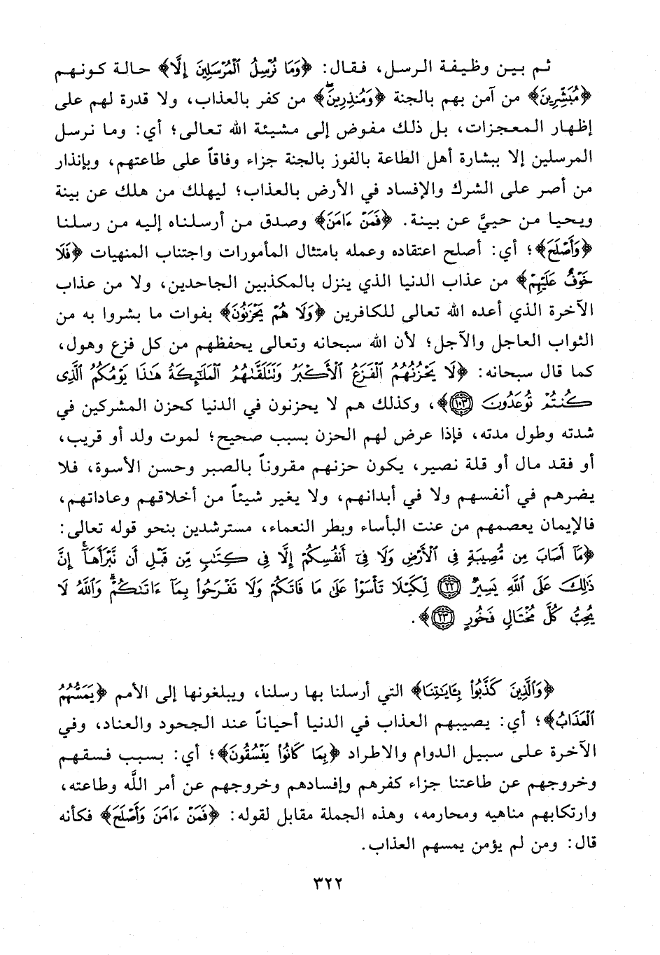 48 - ثم بين وظيفة الرسل، فقال: {وَمَا نُرْسِلُ الْمُرْسَلِينَ إِلَّا} حالة كونهم {مُبَشِّرِينَ} من آمن بهم بالجنة {وَمُنْذِرِينَ} من كفر بالعذاب، ولا قدرة لهم على إظهار المعجزات، بل ذلك مفوض إلى مشيئة الله تعالى؛ أي: وما نرسل المرسلين إلا ببشارة أهل الطاعة بالفوز بالجنة جزاء وفاقًا على طاعتهم، وبإنذار من أصر على الشرك والإفساد في الأرض بالعذاب؛ ليهلك من هلك عن بينة ويحيا من حييَّ عن بينة. {فَمَنْ آمَنَ} وصدق من أرسلناه إليه من رسلنا {وَأَصْلَحَ}؛ أي: أصلح اعتقاده وعمله بامتثال المأمورات واجتناب المنهيات {فَلَا خَوْفٌ عَلَيْهِمْ} من عذاب الدنيا الذي ينزل بالمكذبين الجاحدين، ولا من عذاب الآخرة الذي أعده الله تعالى للكافرين {وَلَا هُمْ يَحْزَنُونَ} بفوات ما بشروا به من الثواب العاجل والآجل؛ لأن الله سبحانه وتعالى يحفظهم من كل فزع وهول، كما قال سبحانه: {لَا يَحْزُنُهُمُ الْفَزَعُ الْأَكْبَرُ وَتَتَلَقَّاهُمُ الْمَلَائِكَةُ هَذَا يَوْمُكُمُ الَّذِي كُنْتُمْ تُوعَدُونَ (103)}، وكذلك هم لا يحزنون في الدنيا كحزن المشركين في شدته وطول مدته، فإذا عرض لهم الحزن بسبب صحيح؛ لموت ولد أو قريب، أو فقد مال أو قلة نصير، يكون حزنهم مقرونًا بالصبر وحسن الأسوة، فلا يضرهم في أنفسهم ولا في أبدانهم، ولا يغير شيئًا من أخلاقهم وعاداتهم، فالإيمان يعصمهم من عنت البأساء وبطر النعماء، مسترشدين بنحو قوله تعالى: {مَا أَصَابَ مِنْ مُصِيبَةٍ فِي الْأَرْضِ وَلَا فِي أَنْفُسِكُمْ إِلَّا فِي كِتَابٍ مِنْ قَبْلِ أَنْ نَبْرَأَهَا إِنَّ ذَلِكَ عَلَى اللَّهِ يَسِيرٌ (22) لِكَيْلَا تَأْسَوْا عَلَى مَا فَاتَكُمْ وَلَا تَفْرَحُوا بِمَا آتَاكُمْ وَاللَّهُ لَا يُحِبُّ كُلَّ مُخْتَالٍ فَخُورٍ (23)}.