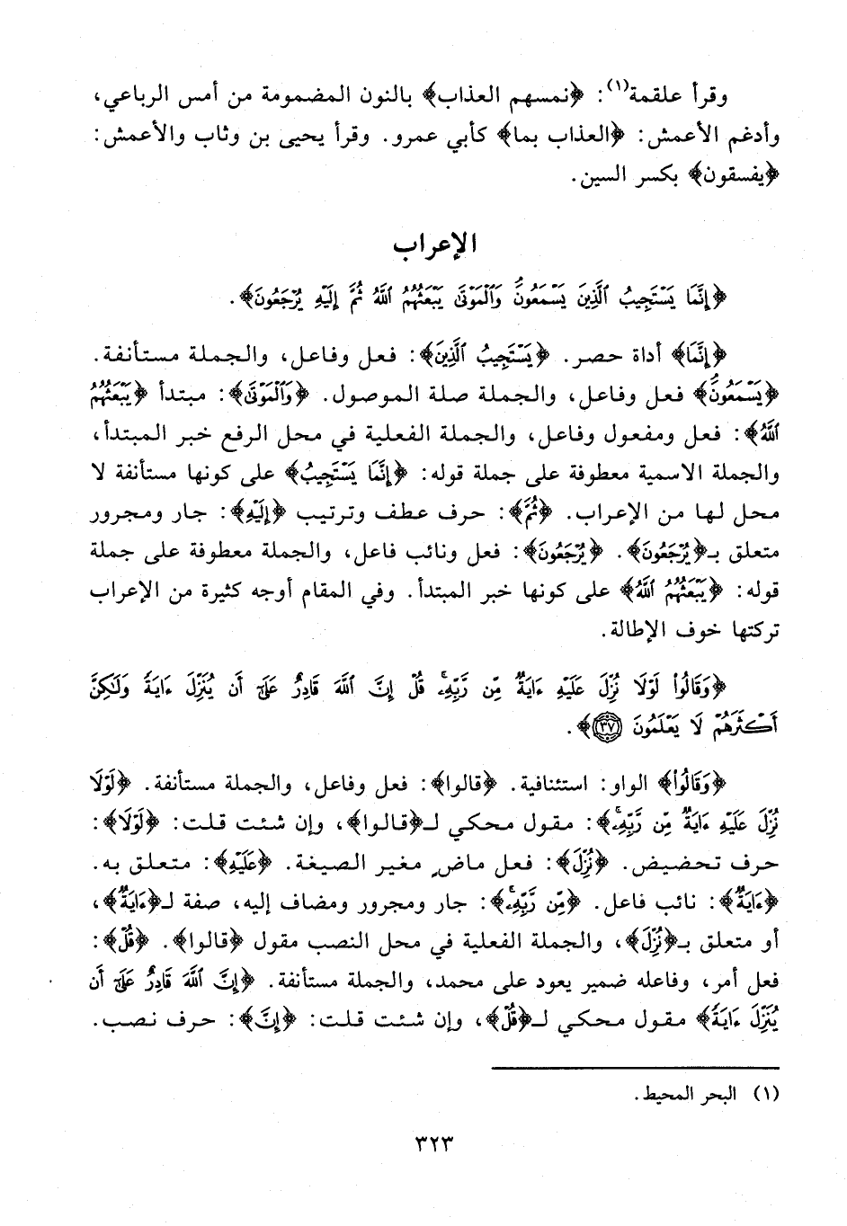 {إِنَّمَا} أداة حصر. {يَسْتَجِيبُ الَّذِينَ}: فعل وفاعل، والجملة مستأنفة. {يَسْمَعُونَ} فعل وفاعل، والجملة صلة الموصول. {وَالْمَوْتَى}: مبتدأ {يَبْعَثُهُمُ اللَّهُ}: فعل ومفعول وفاعل، والجملة الفعلية في محل الرفع خبر المبتدأ، والجملة الاسمية معطوفة على جملة قوله: {إِنَّمَا يَسْتَجِيبُ} على كونها مستأنفة لا محل لها من الإعراب. {ثُمَّ}: حرف عطف وترتيب {إِلَيْهِ}: جار ومجرور متعلق بـ {يُرْجَعُونَ}. {يُرْجَعُونَ}: فعل ونائب فاعل، والجملة معطوفة على جملة قوله: {يَبْعَثُهُمُ اللَّهُ} على كونها خبر المبتدأ. وفي المقام أوجه كثيرة من الإعراب تركتها خوف الإطالة.