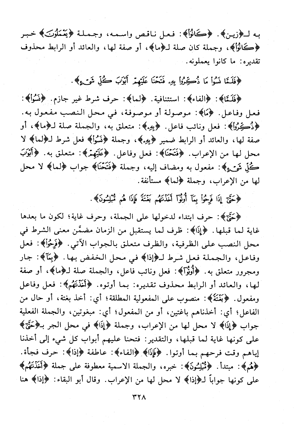 {حَتَّى}: حرف ابتداء لدخولها على الجملة، وحرف غاية؛ لكون ما بعدها غاية لما قبلها. {إذَا}: ظرف لما يستقبل من الزمان مضمَّن معنى الشرط في محل النصب على الظرفية، والظرف متعلق بالجواب الآتي. {فَرِحُوا}: فعل وفاعل، والجملة فعل شرط لـ {إذا} في محل الخفض بها. {بِمَا}: جار ومجرور متعلق به. {أُوتُوا}: فعل ونائب فاعل، والجملة صلة لـ {ما}، أو صفة لها، والعائد أو الرابط محذوف تقديره: بما أوتوه. {أَخَذْنَاهُمْ}: فعل وفاعل ومفعول. {بَغْتَةً}: منصوب على المفعولية المطلقة؛ أي: أخذ بغتة، أو حال من الفاعل؛ أي: أخذناهم باغتين، أو من المفعول؛ أي: مبغوتين، والجملة الفعلية جواب {إِذَا} لا محل لها من الإعراب، وجملة {إِذَا} في محل الجر بـ {حَتَّى} على كونها غاية لما قبلها، والتقدير: فتحنا عليهم أبواب كل شيء إلى أخذنا إياهم وقت فرحهم بما أوتوا. {فَإِذَا} {الفاء}: عاطفة {إذا}: حرف فجأة. {هُم}: مبتدأ. {مُبْلِسُونَ}: خبره، والجملة الإسمية معطوفة على جملة {أَخَذْنَاهُمْ} على كونها جوابًا لـ {إذا} لا محل لها من الإعراب وقال أبو البقاء: {إذا} هنا