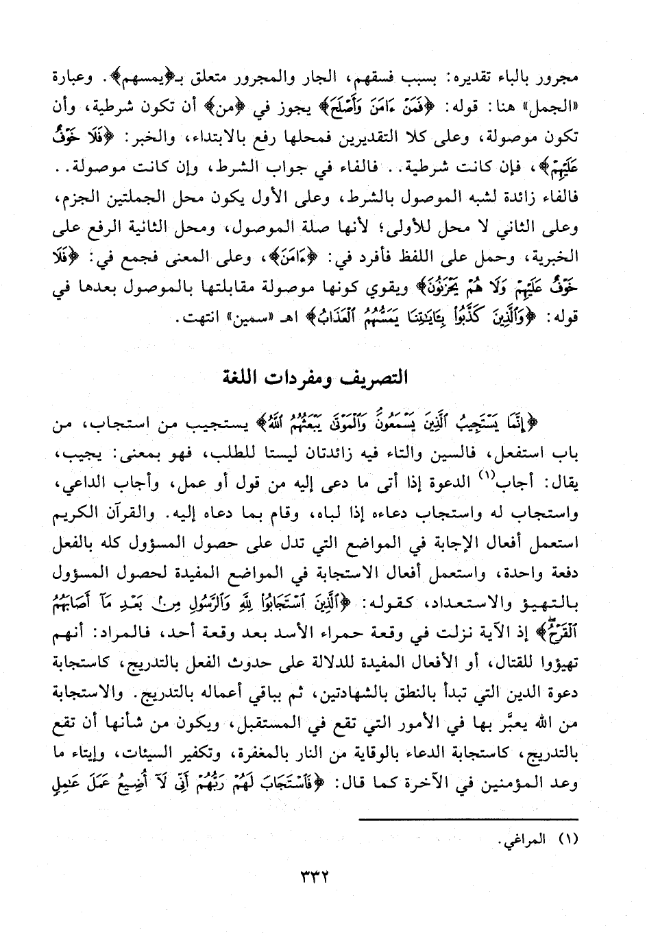 {إِنَّمَا يَسْتَجِيبُ الَّذِينَ يَسْمَعُونَ وَالْمَوْتَى يَبْعَثُهُمُ اللَّهُ} يستجيب من استجاب، من باب استفعل، فالسين والتاء فيه زائدتان ليستا للطلب، فهو بمعنى: يجيب، يقال: أجاب (¬1) الدعوة إذا أتى ما دعى إليه من قول أو عمل، وأجاب الداعي، واستجاب له واستجاب دعاءه إذا لباه، وقام بما دعاه إليه. والقرآن الكريم استعمل أفعال الإجابة في المواضع التي تدل على حصول المسؤول كله بالفعل دفعة واحدة، واستعمل أفعال الاستجابة في المواضع المفيدة لحصول المسؤول بالتهيؤ والاستعداد، كقوله {الَّذِينَ اسْتَجَابُوا لِلَّهِ وَالرَّسُولِ مِنْ بَعْدِ مَا أَصَابَهُمُ الْقَرْحُ} إذ الآية نزلت في وقعة حمراء الأسد بعد وقعة أحد، فالمراد: أنهم تهيؤوا للقتال، أو الأفعال المفيدة للدلالة على حدوث الفعل بالتدريج، كاستجابة دعوة الدين التي تبدأ بالنطق بالشهادتين، ثم بباقي أعماله بالتدريج. والاستجابة من الله يعبَّر بها في الأمور التي تقع في المستقبل، ويكون من شأنها أن تقع بالتدريج، كاستجابة الدعاء بالوقاية من النار بالمغفرة، وتكفير السيئات، وإيتاء ما وعد المؤمنين في الآخرة كما قال: {فَاسْتَجَابَ لَهُمْ رَبُّهُمْ أَنِّي لَا أُضِيعُ عَمَلَ عَامِلٍ